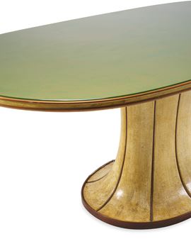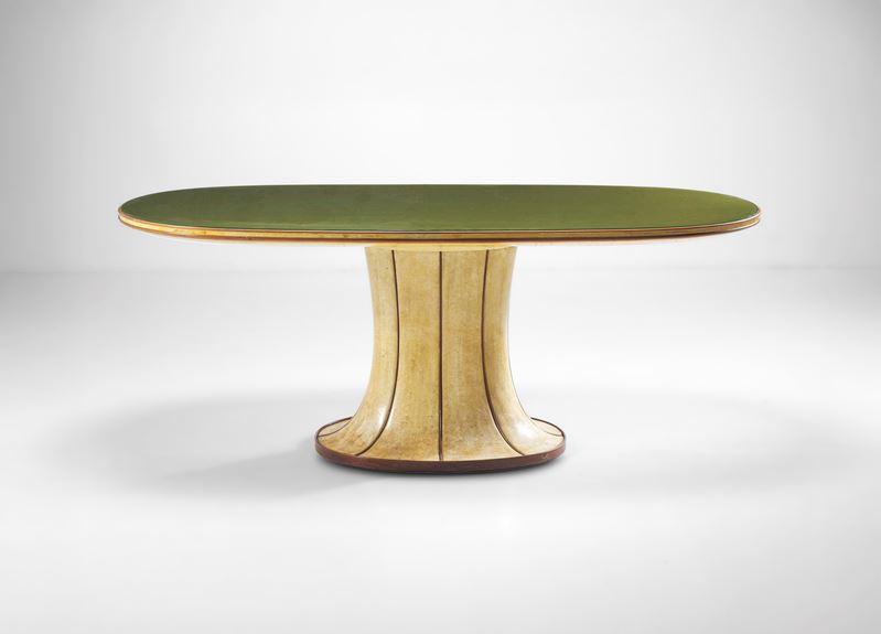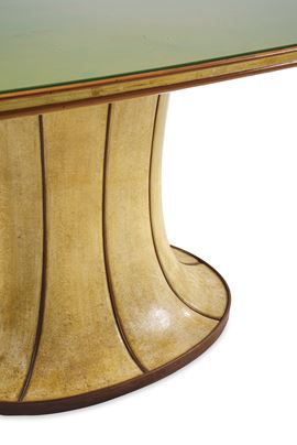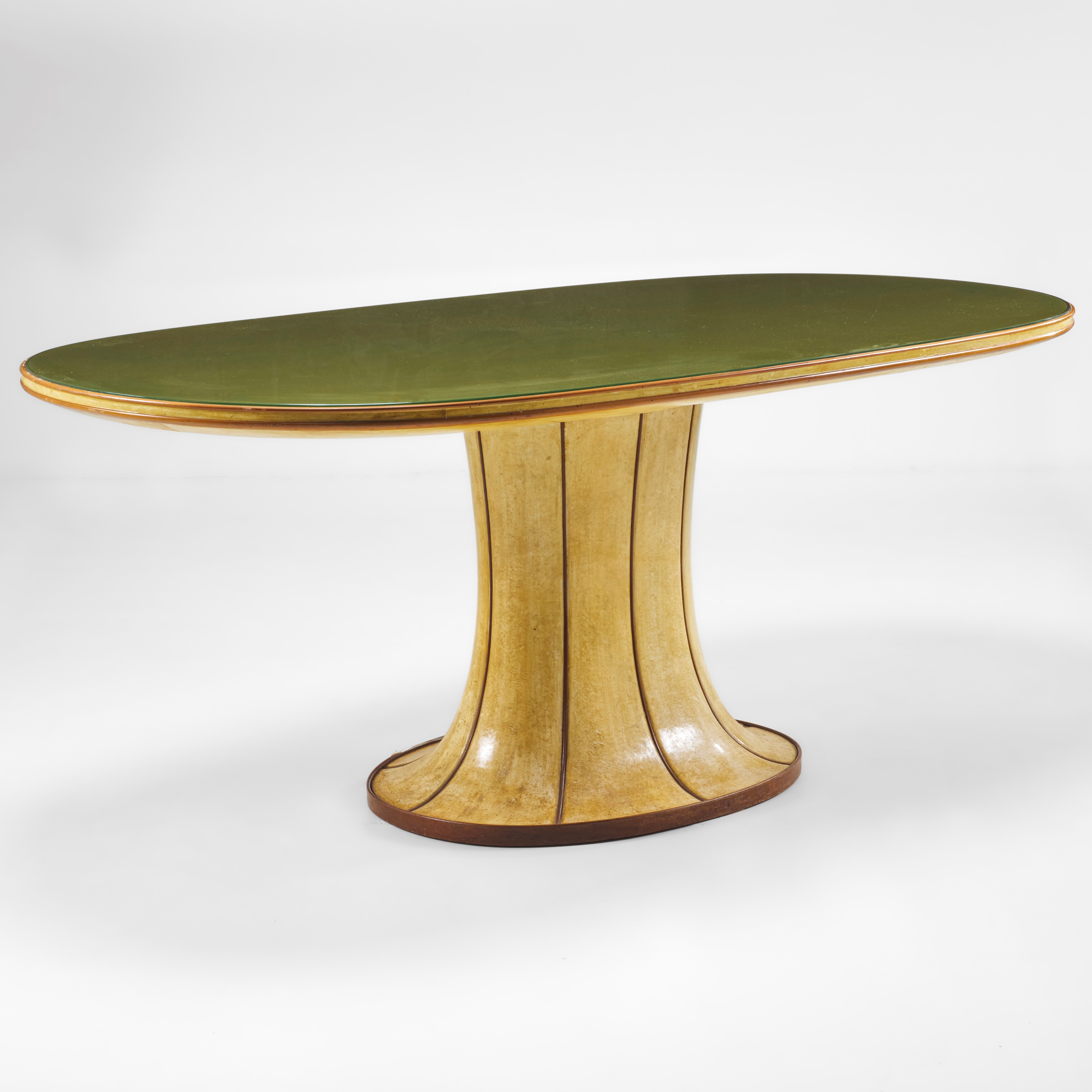 Struttura in legno con rivestimenti in pergamena. Piano in legno e vetro colorato. Dettagli in ottone.