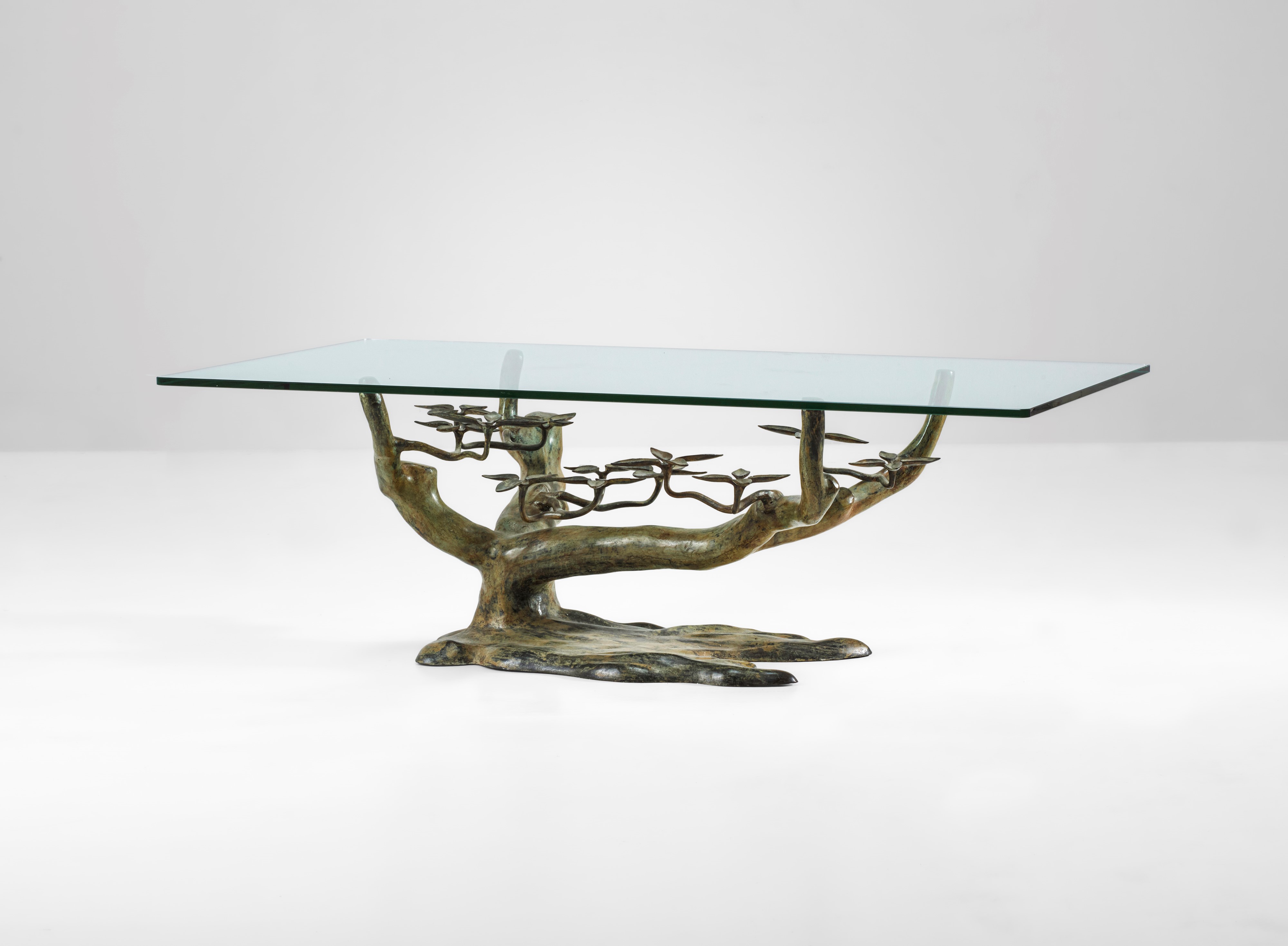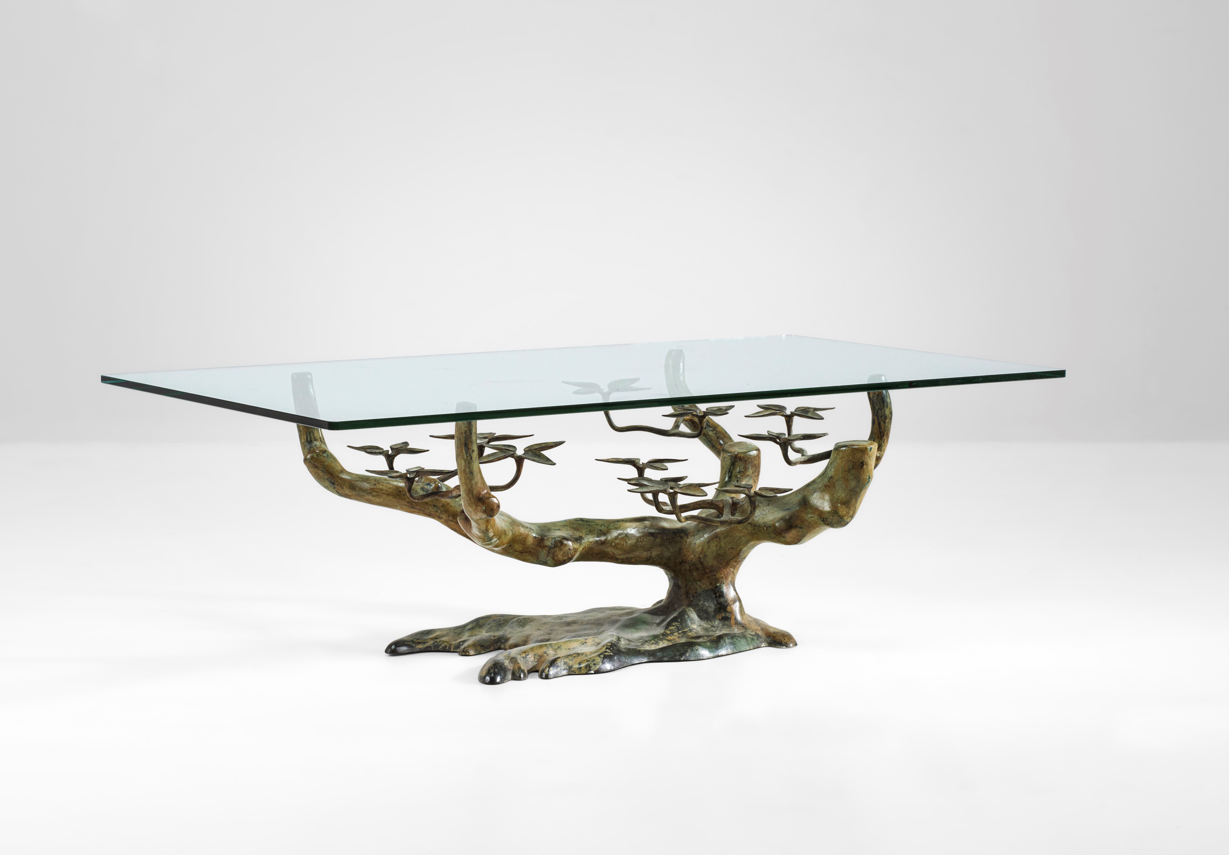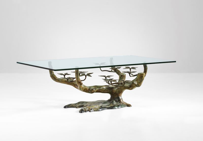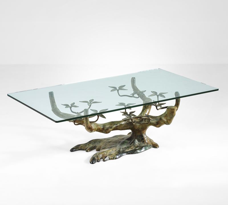 Struttura in fusione di bronzo patinato. Piano in cristallo molato.