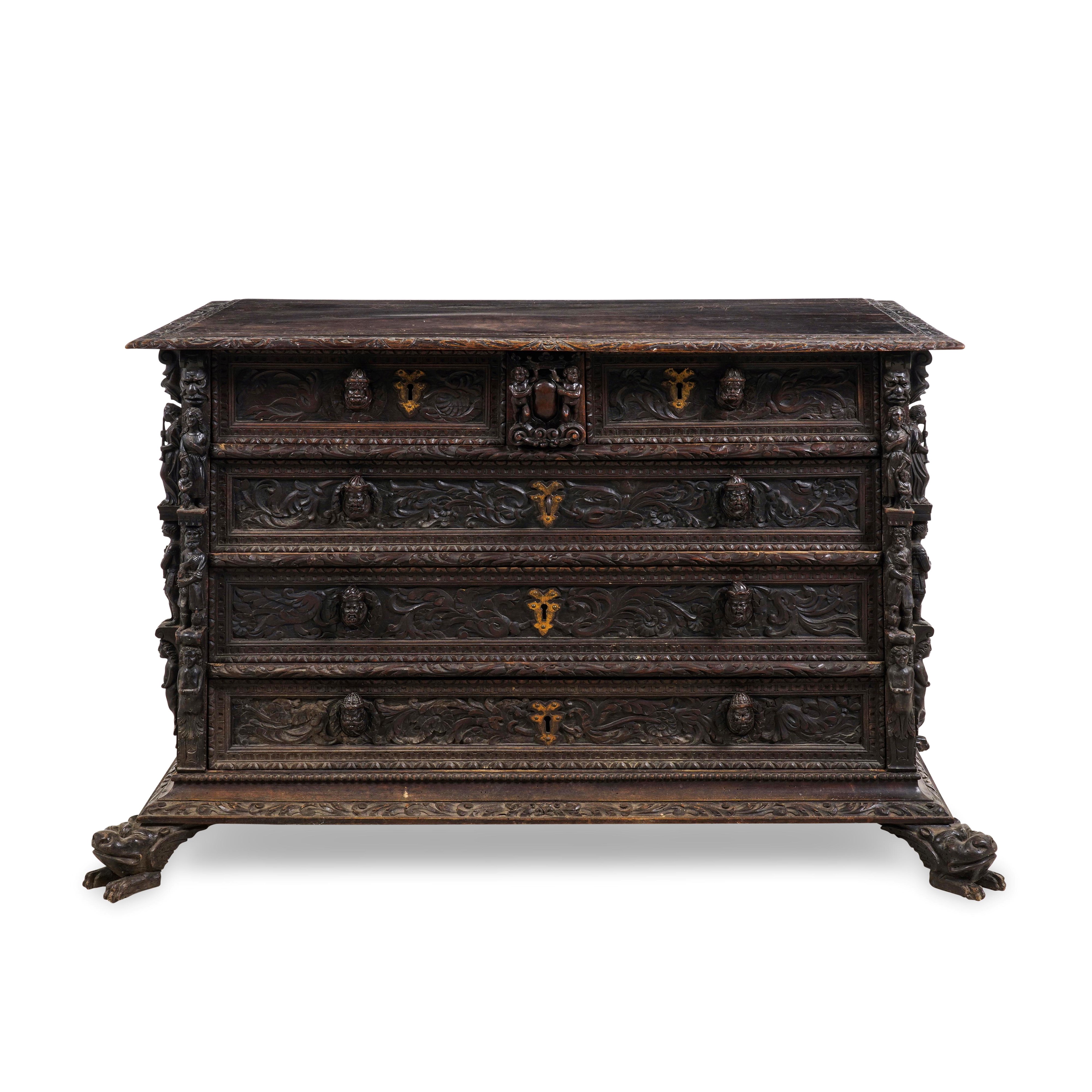 Noce intagliato e scolpito. Fronte a tre cassetti e due più piccoli affiancati, cassettino segreto al centro celato da stemma nobiliare, decoro di racemi fogliati intagliati, montanti con figure accoppiate e scolpite a tuttotondo, maniglie a foggia di teste virili, piedi scolpiti ad animali fantastici
