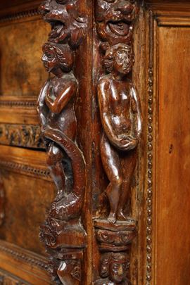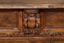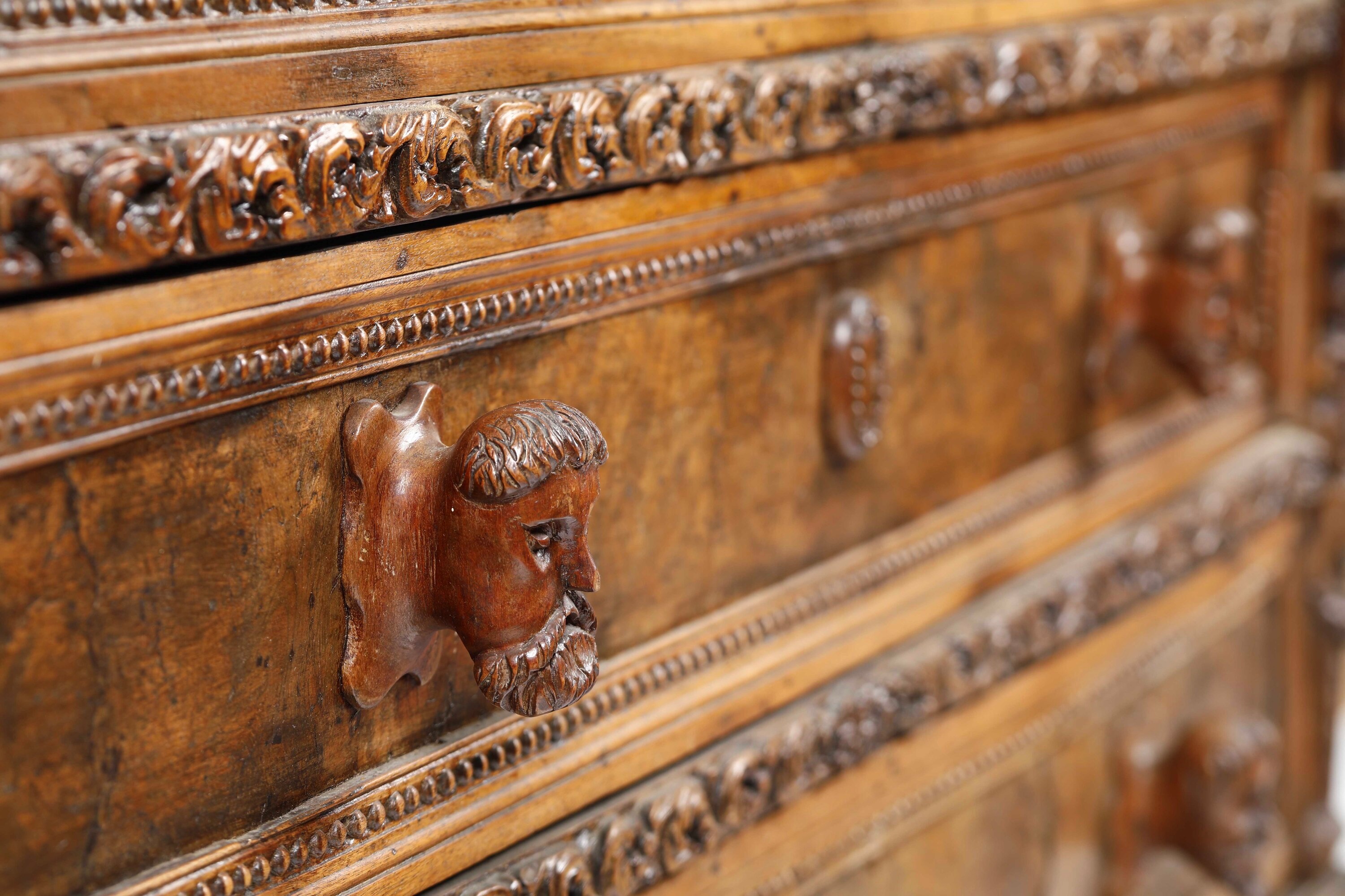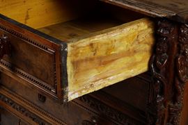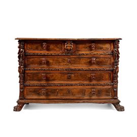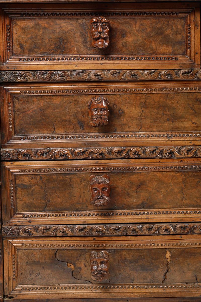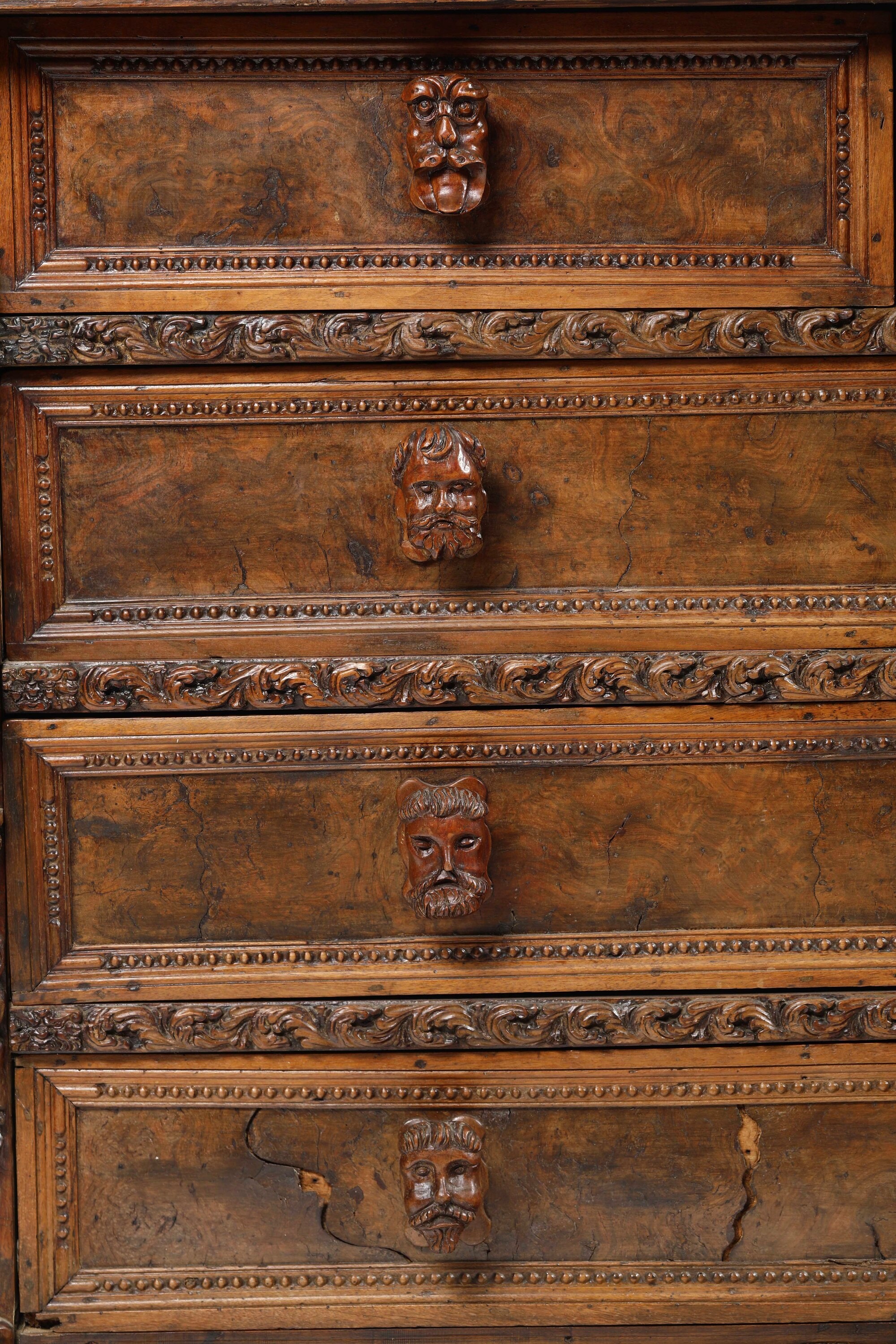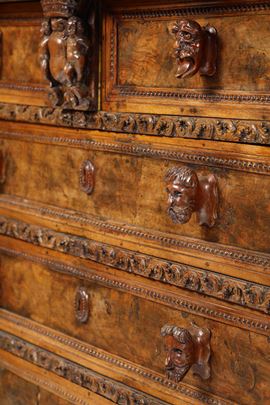 Tre cassetti affiancati nella fascia e tre sottostanti con cornici riccamente scolpite a foglie stilizzate, specchiatura dei cassetti in radica, lesene angolari con figure accoppiate a tuttotondo, piedi ferini, maniglie intagliate a mascheroni non coeve (difetti e restauri)