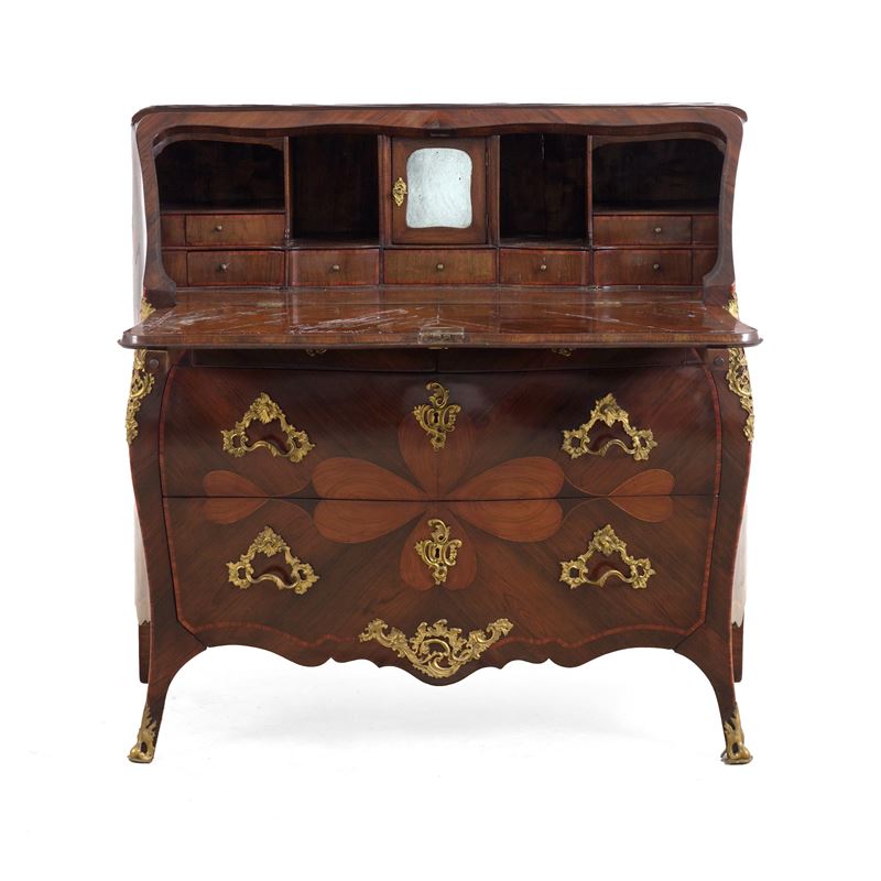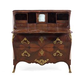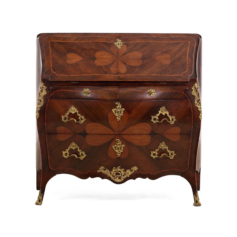 Mosso sul fronte e sui fianchi, lastronatura di fondo in violetto con intarsi con motivi di quadrifogli e cuori più volte ripetuti, pendaglina sagomata. Fronte a due cassetti grandi e due piccoli affiancati, anta ribaltabile celante interno mosso con sportello centrale, cassettini e vani a giorno. Montature, bocchette e scarpette in bronzo cesellato e dorato