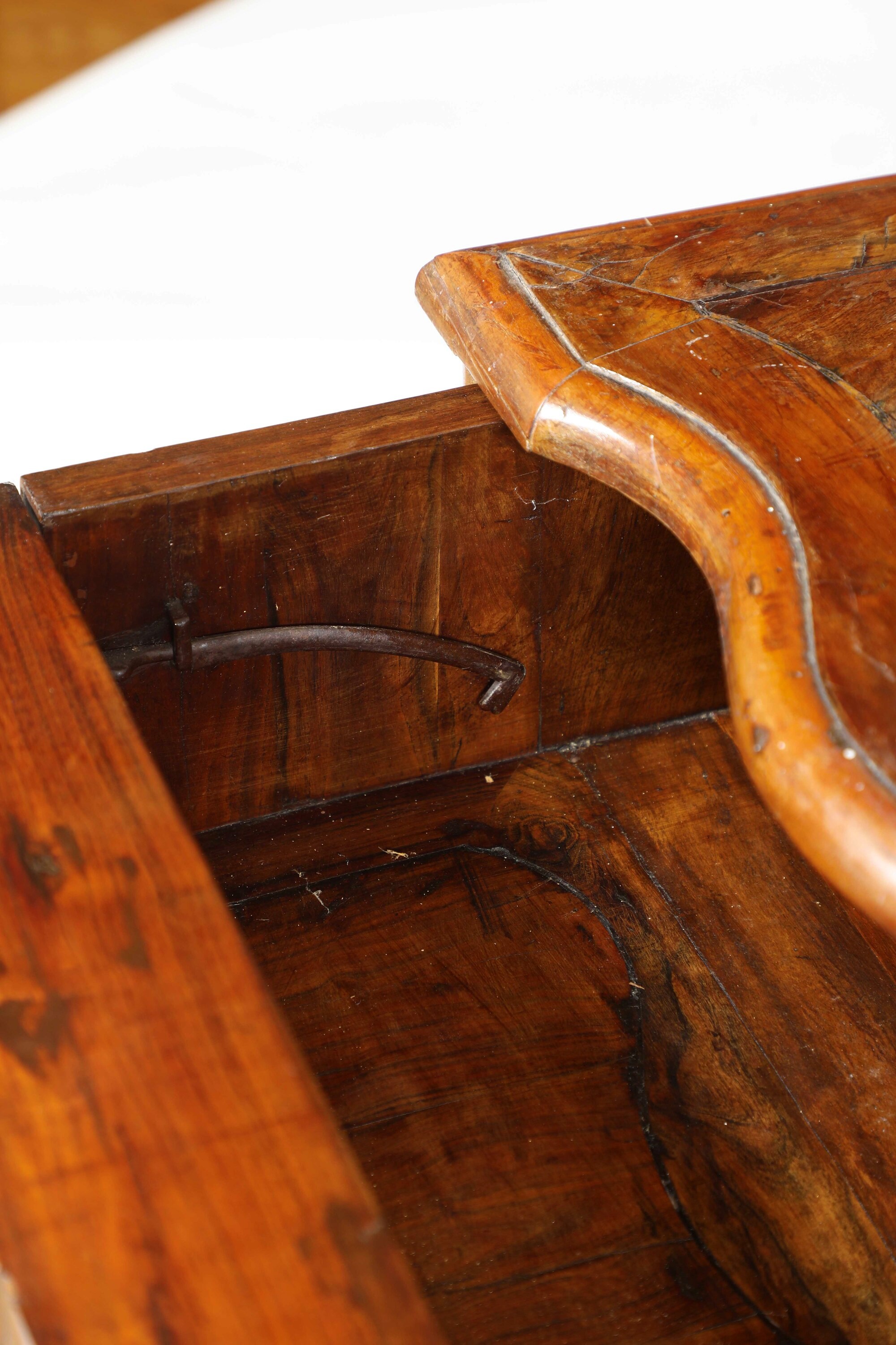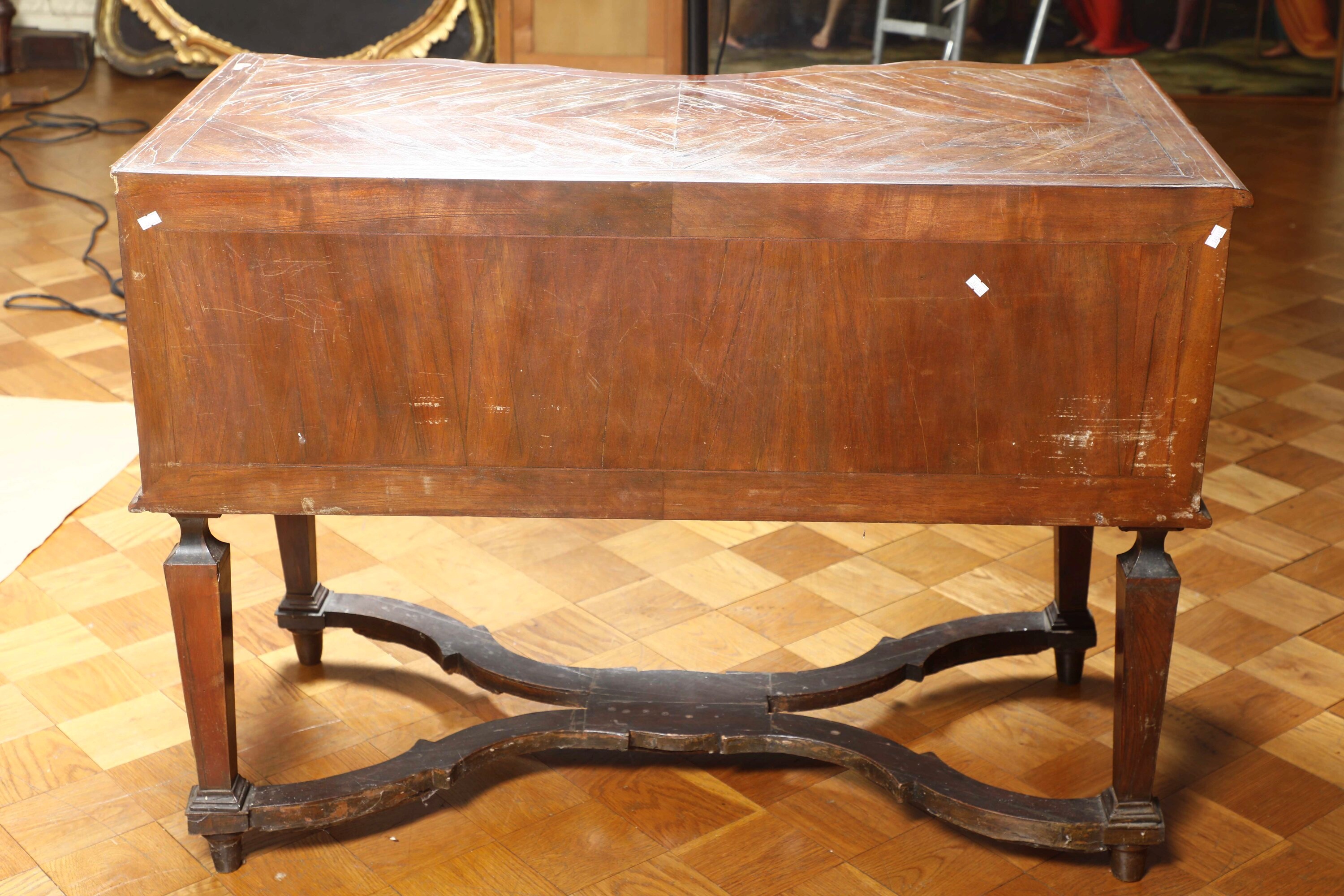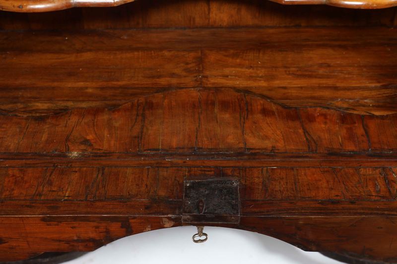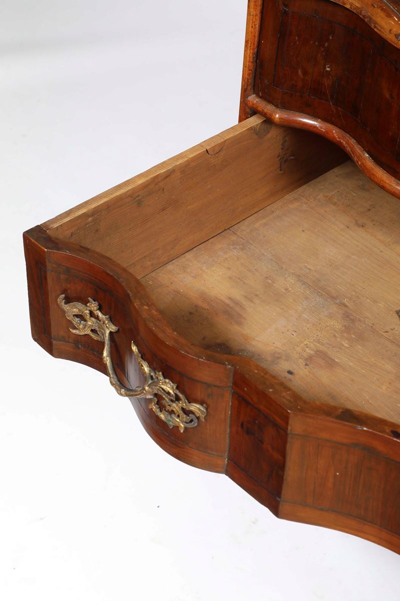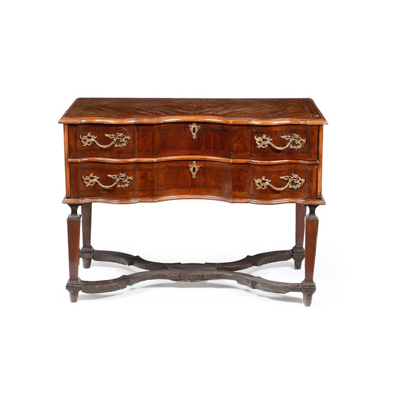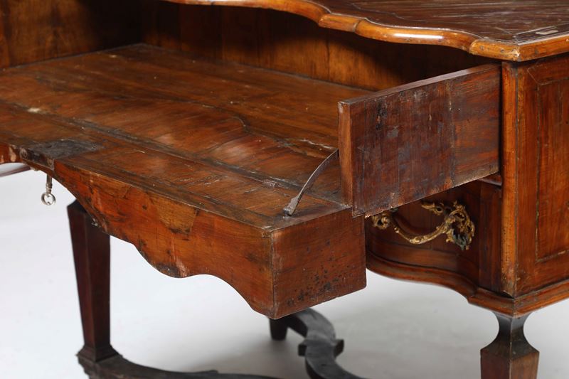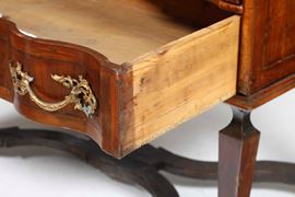 Legno lastronato. Fronte mosso a due cassetti, piano sagomato, gambe rastremate riunite da traverse sagomate
