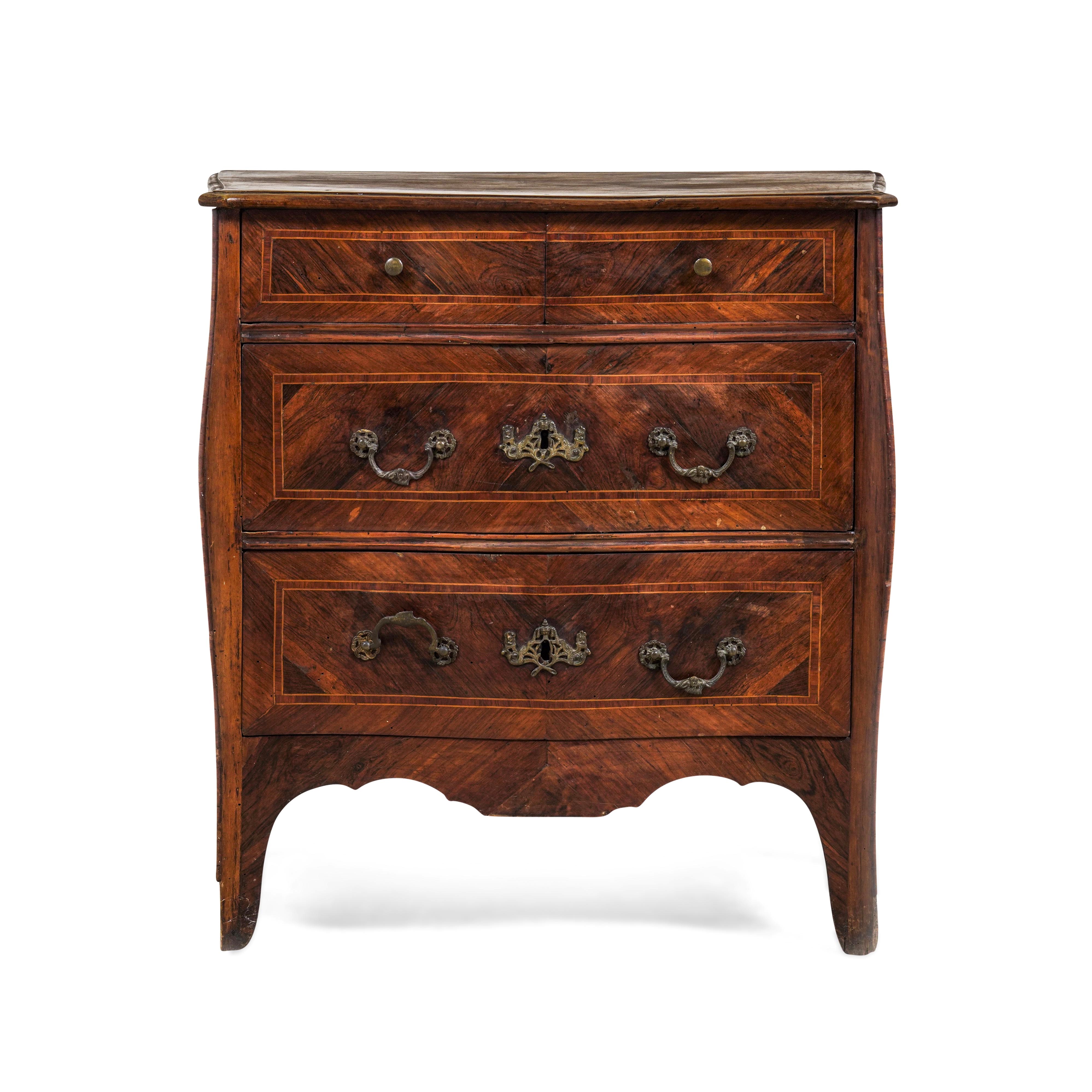 Lastronato in palissandro e filettato. Fronte e fianchi lievemente mossi. Due cassetti e due cassettini affiancati sotto al piano sagomato