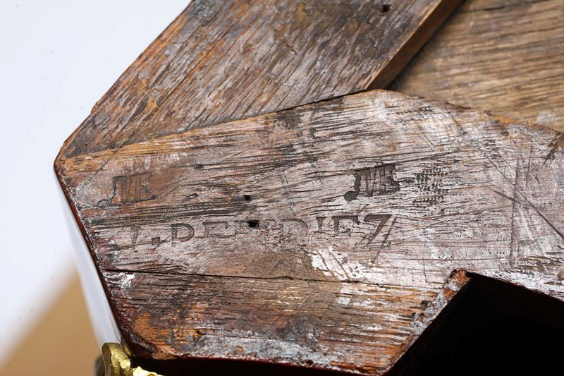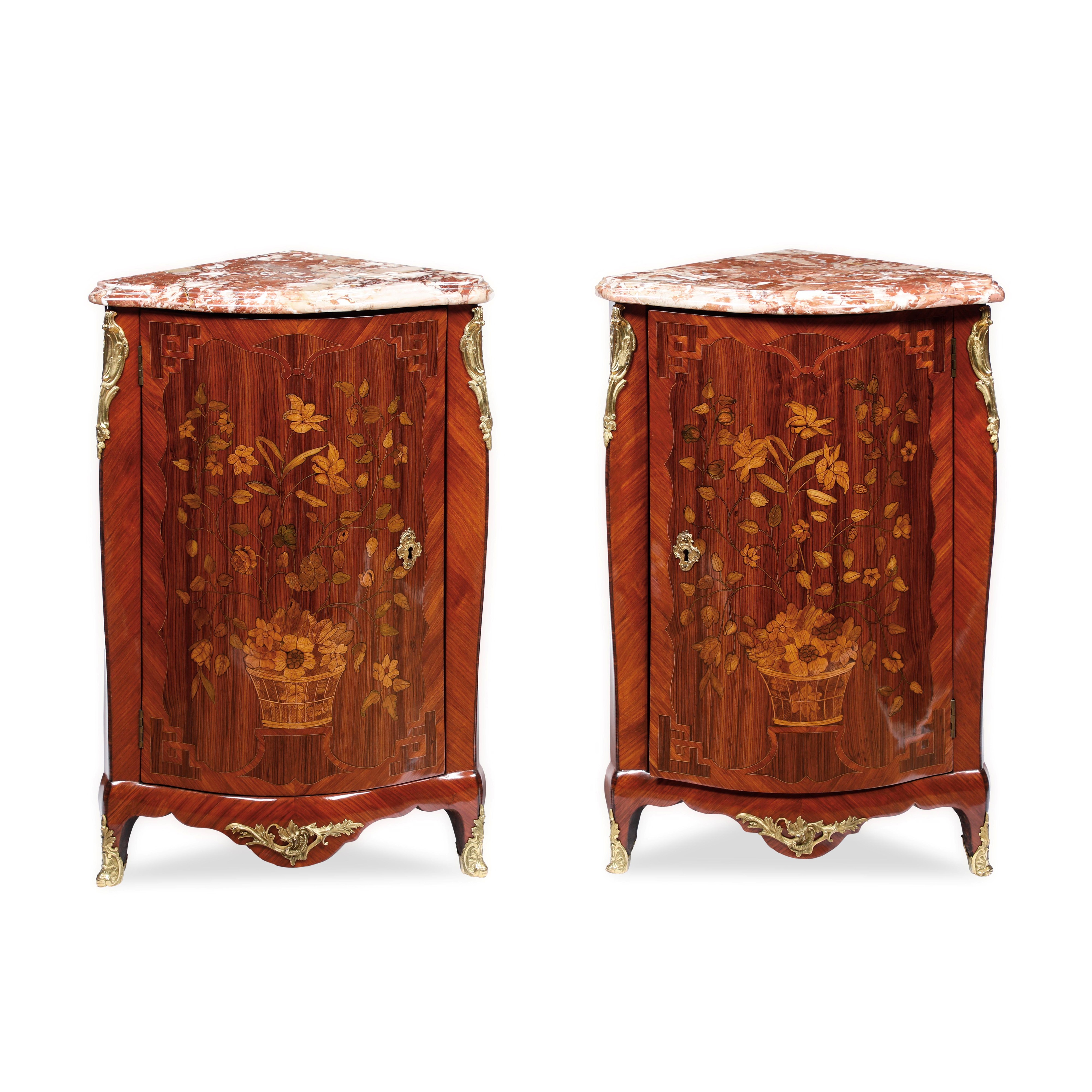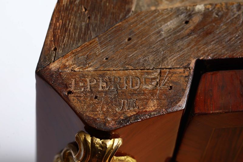 Lastronate in bois de rose e bois de violette e finemente intarsiate in legni chiari e legni tinti. Fronte di forma mossa e bombata ad un'anta centrata da vaso fiorito da cui si dipartono alti racemi di foglie e fiori, il tutto incorniciato da sottili filetti di forma mistilinea. Pendaglina sagomata, montanti e piedi leggermente mossi, arricchiti da applicazioni in bronzo cesellato e dorato. Piano in marmo. Stampigliate L. PERIDIEZ sotto il piano in corrispondenza dei montanti.