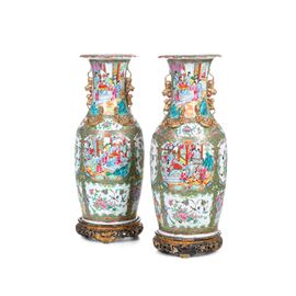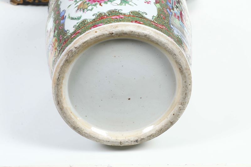Coppia di grandi vasi in porcellana raffiguranti scene di corte entro riserve e decori a motivi vegetali, manici a foggia di draghi a rilievo, Canton, Cina, Dinastia Qing, XIX secolo