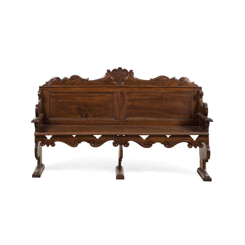 Schienale pannellato e intagliato a volute, montanti e fascia sotto la seduta sagomati