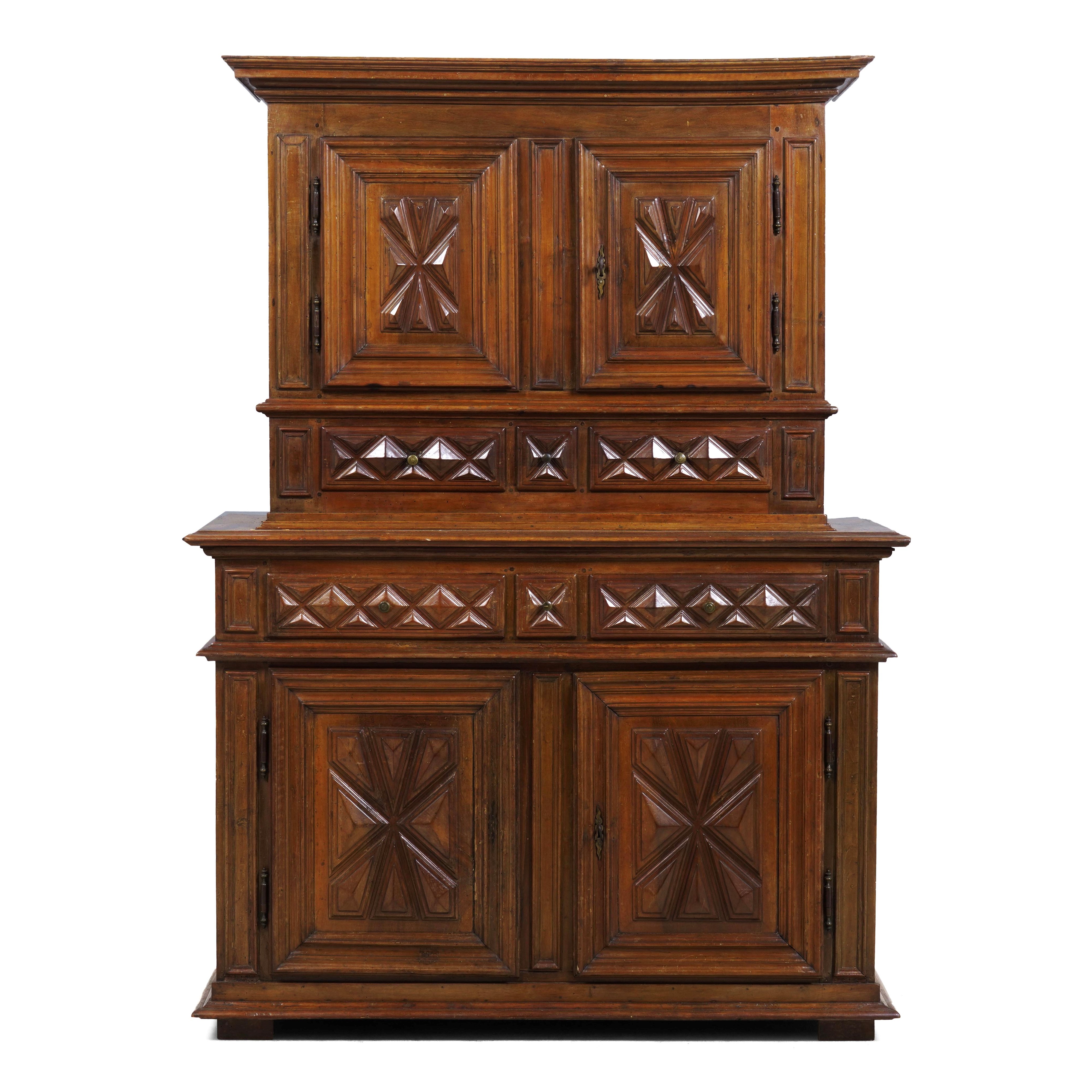 Credenza doppio corpo in in noce intagliato. Piemonte o Liguria, XVII secolo