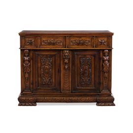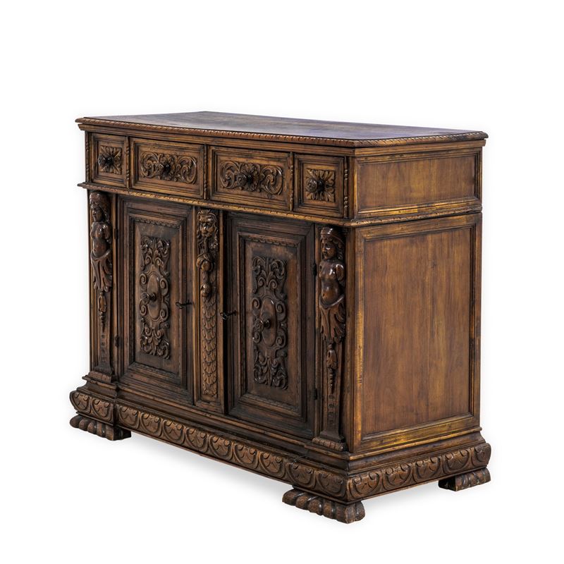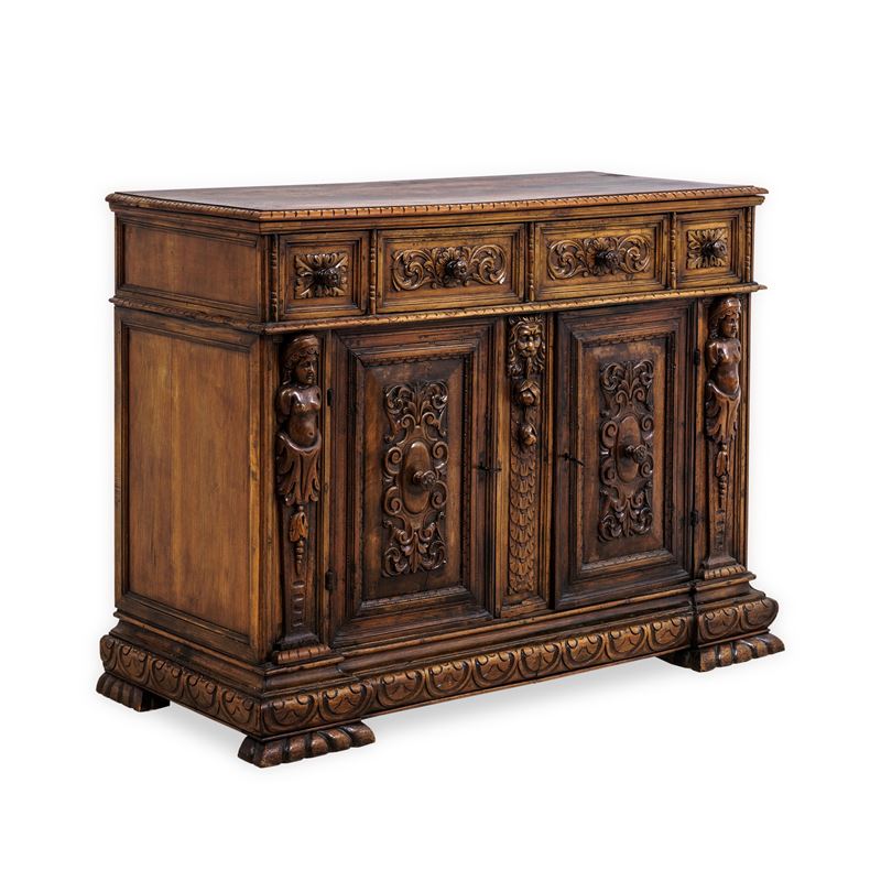 Fronte a due ante sormontate da quattro cassetti. Ricco decoro a girali fogliacei, montanti laterali a foggia di erme, montante centrale terminante a testa leonina