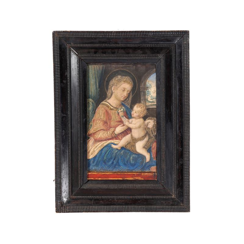 Dipinto e ricamo in seta su pergamena raffigurante Madonna con Bambino. XVI-XVII secolo