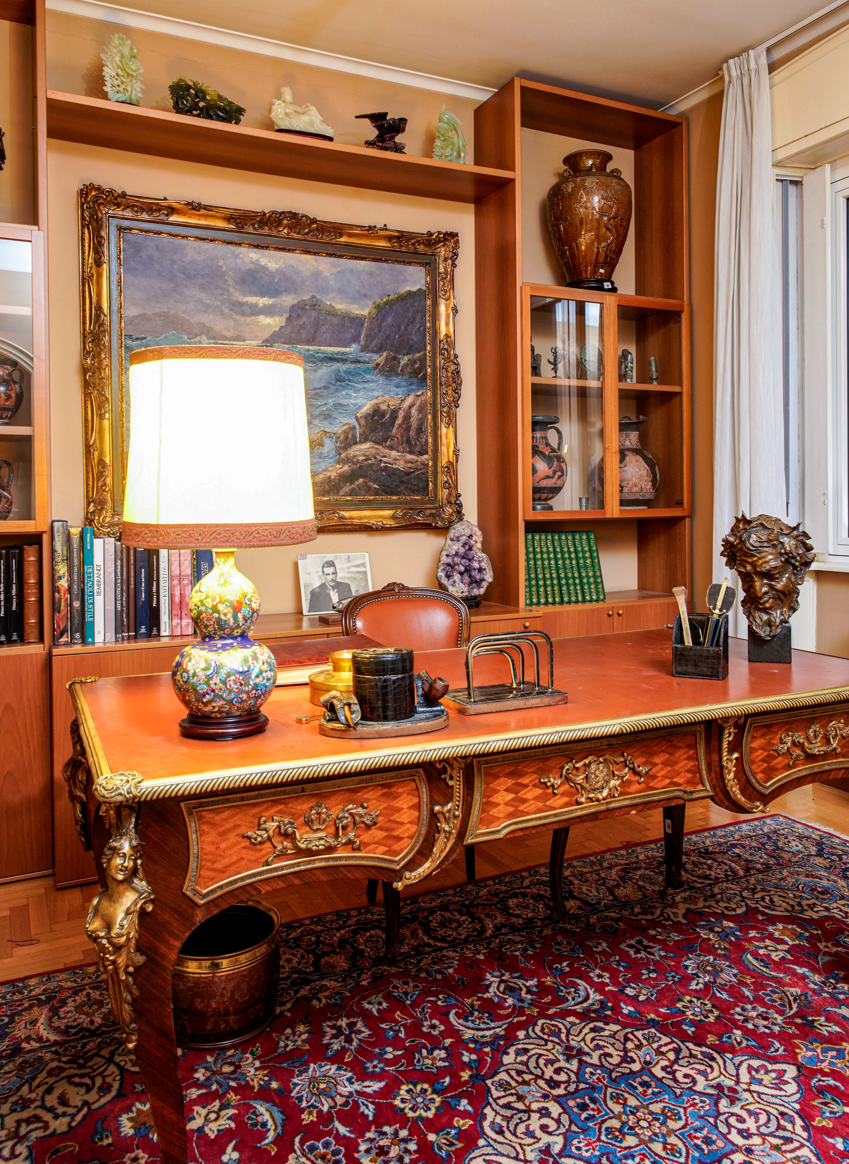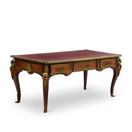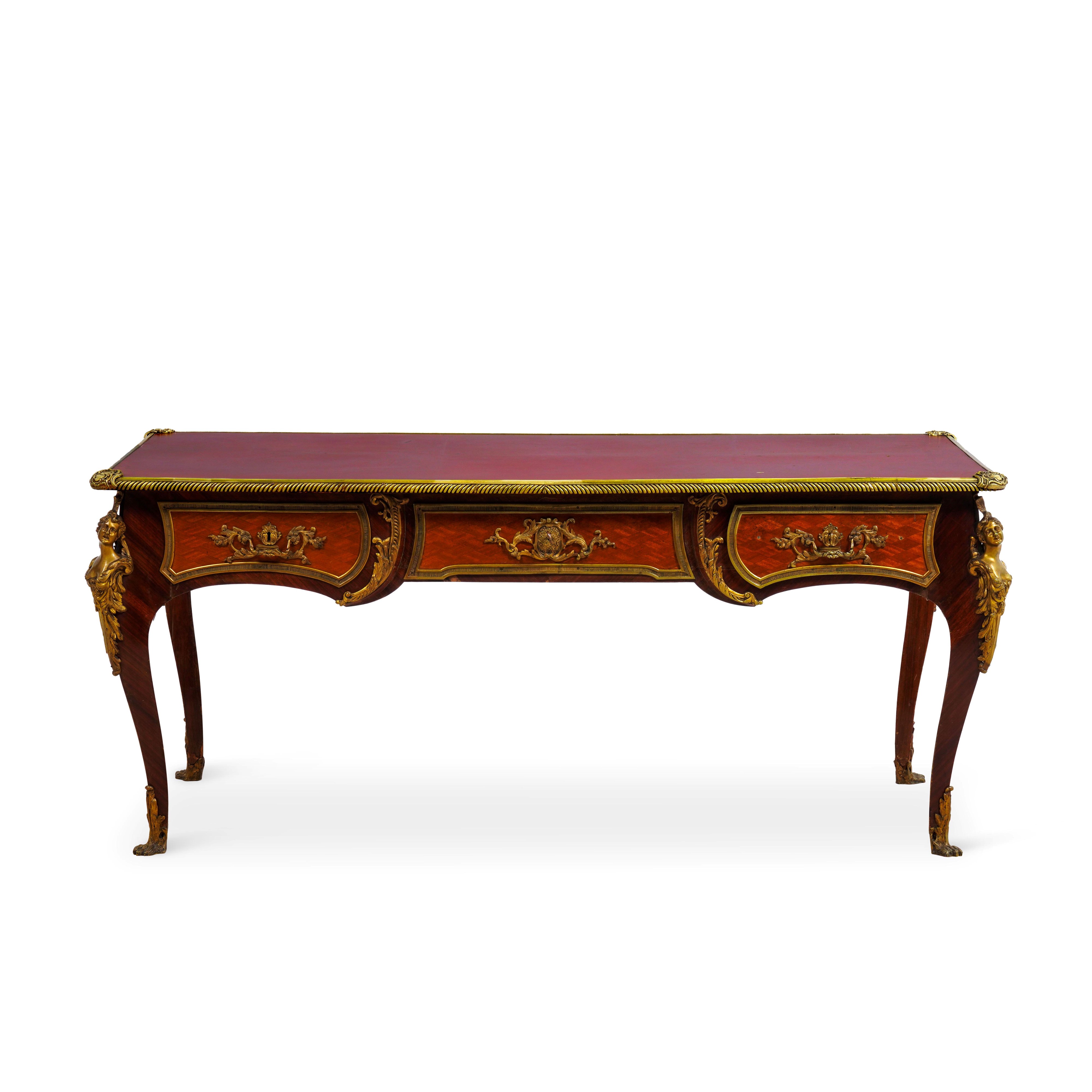 Lastronata in palissandro, tre cassetti nella fascia, piano foderato in cuoio, gambe mosse, profili e ricche applicazioni decorative a foggia di figure femminili e figure bacchiche in bronzo dorato