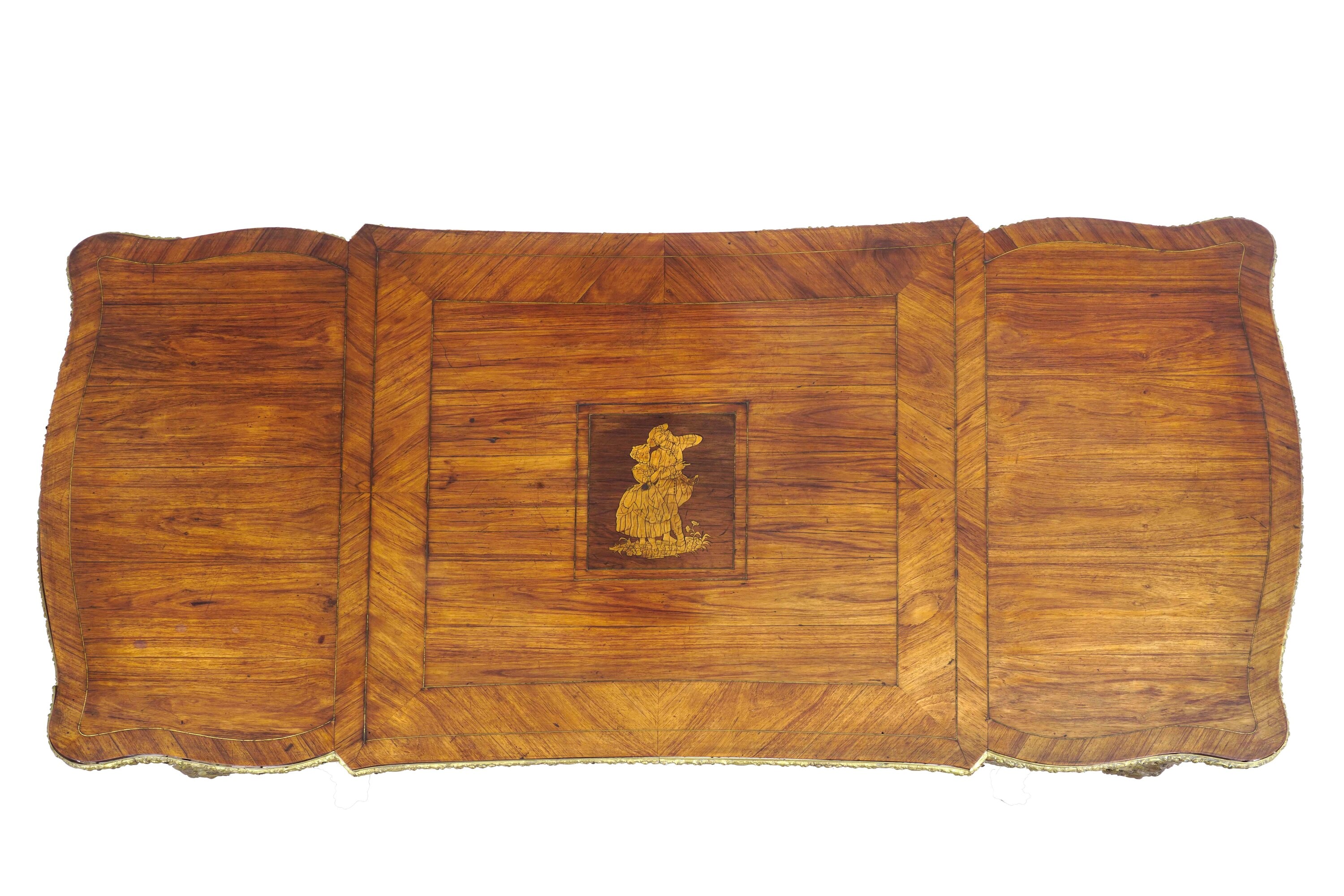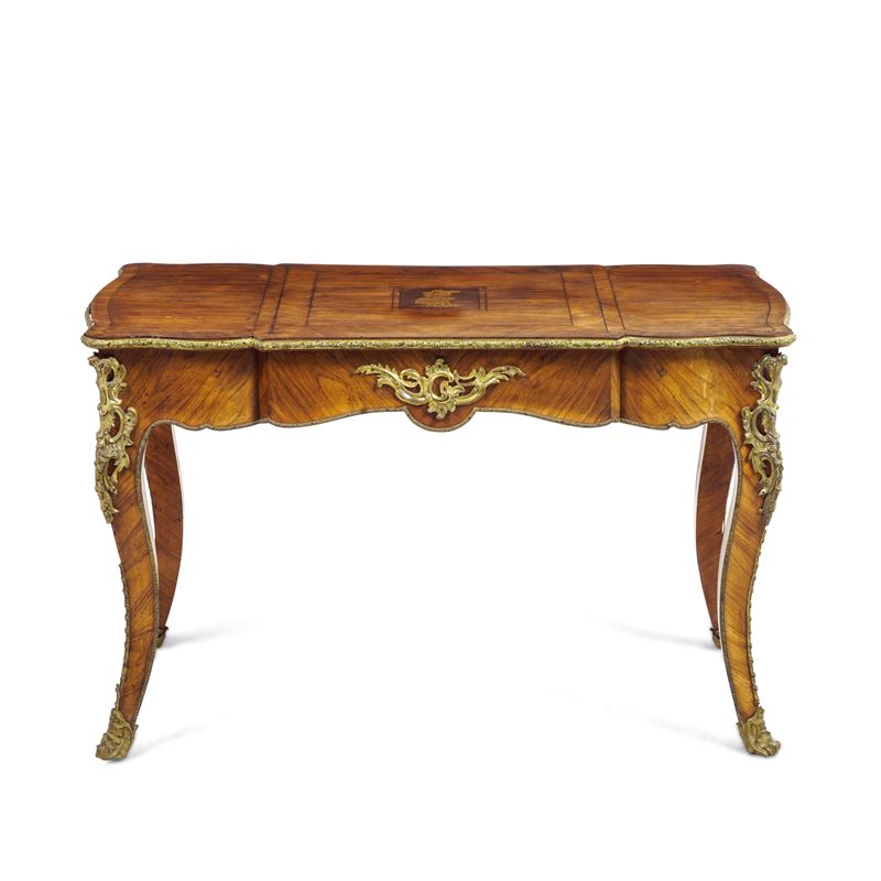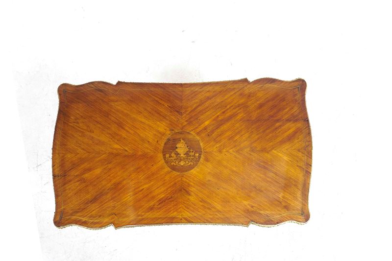 Di forma mossa ma con sagome differenti. Lastronate in bois de rose con profili e applicazioni in bronzo dorato. Piani decorati da intarsi diversi (lievi differenze)