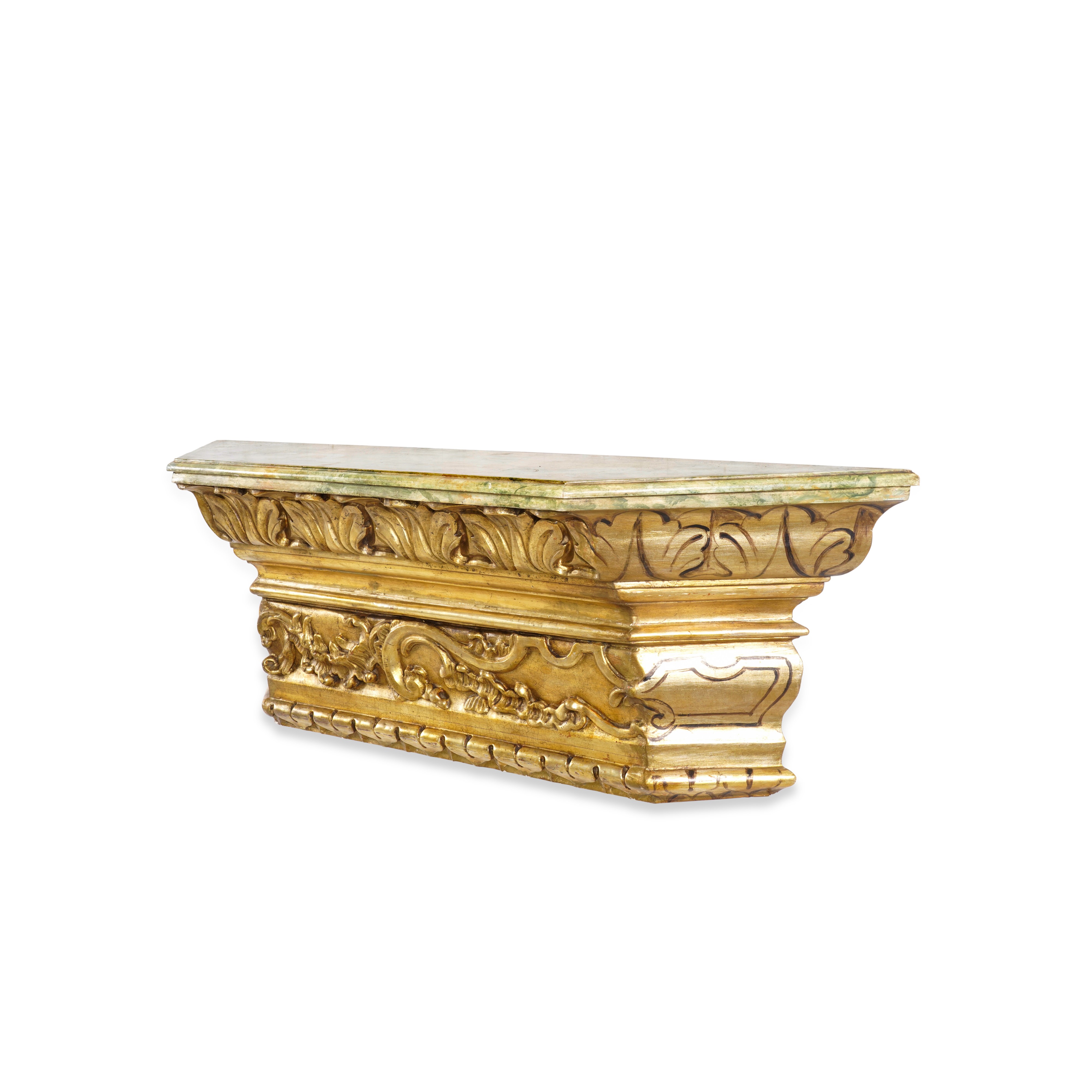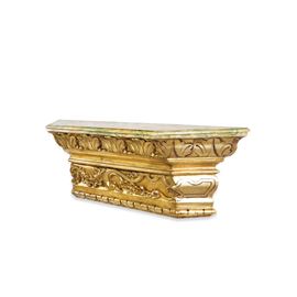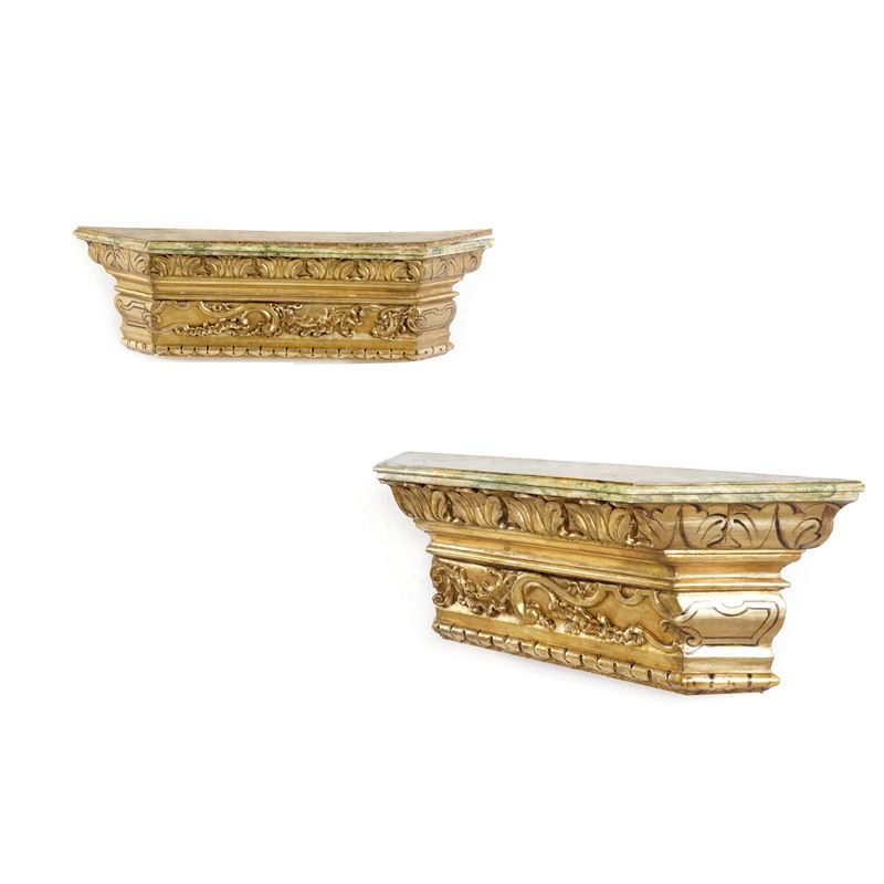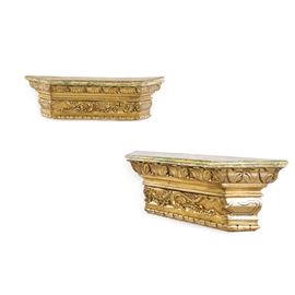 Due mensole in legno intagliato, dipinto e dorato. XX secolo