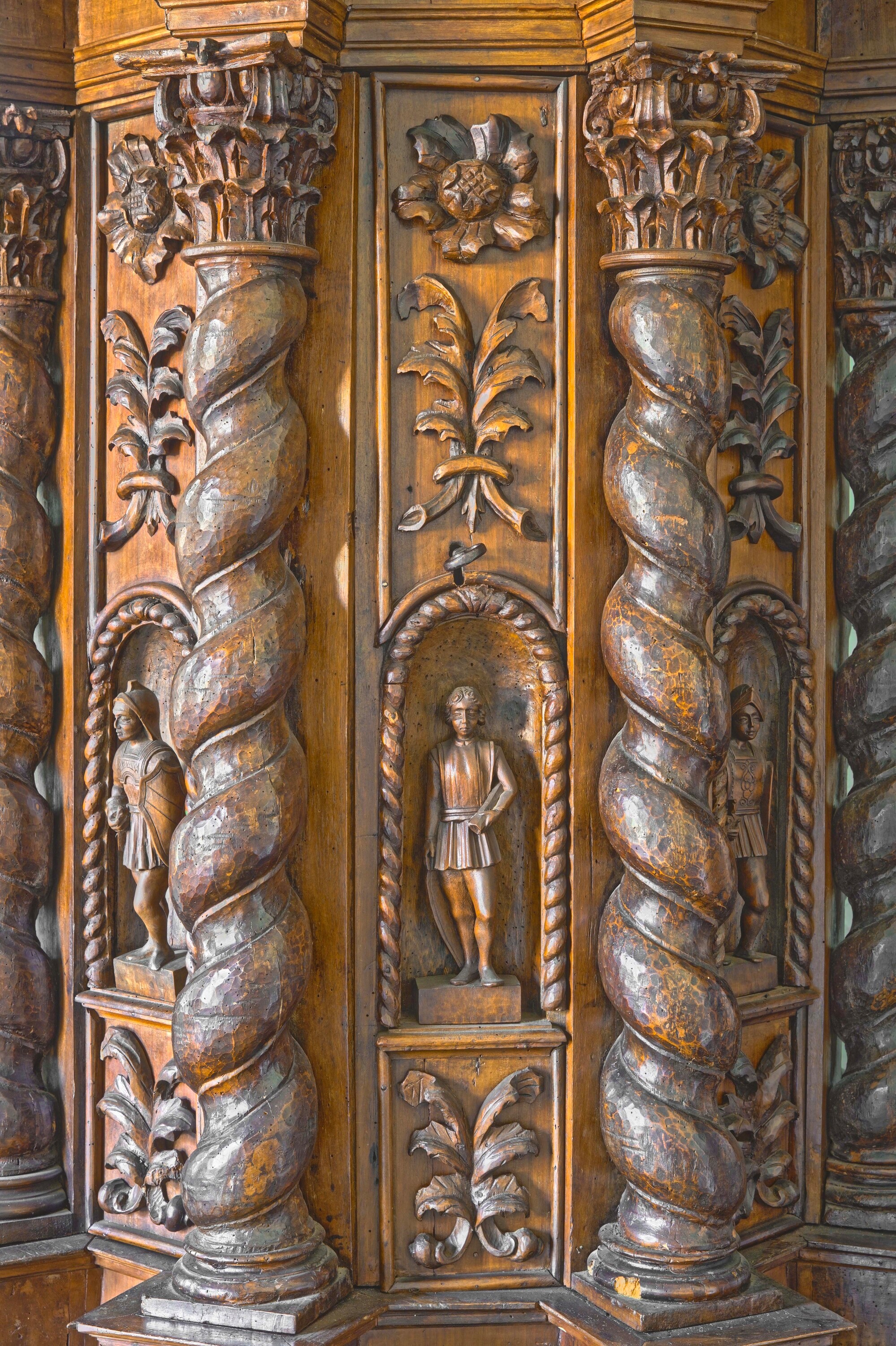 Noce scolpito. Di forma ottagonale, le colonne a torciglioni sormontate da sculture scandiscono le otto sezioni arricchite da lesene con edicole e figure scolpite. Cupola intagliata a motivi vegetali, base a doppie volute e riccioli su ripiano ottagonale