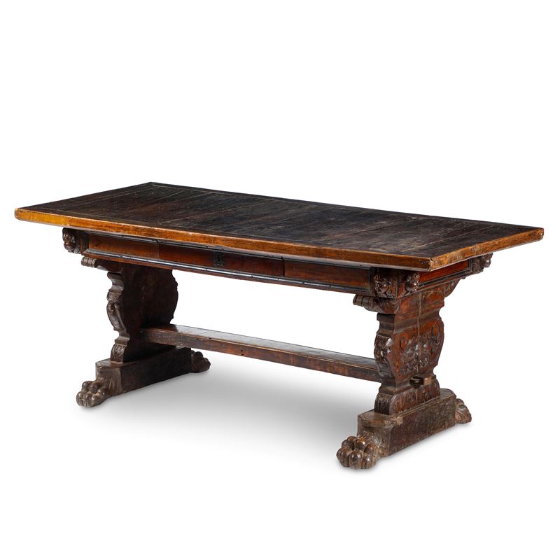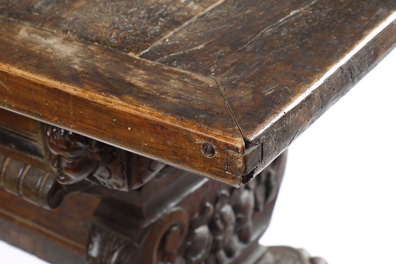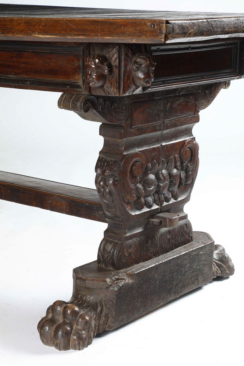 Elementi angolari e montanti scolpiti a mascheroni e motivi vegetali, cassetto sottopiano, piedi ferini