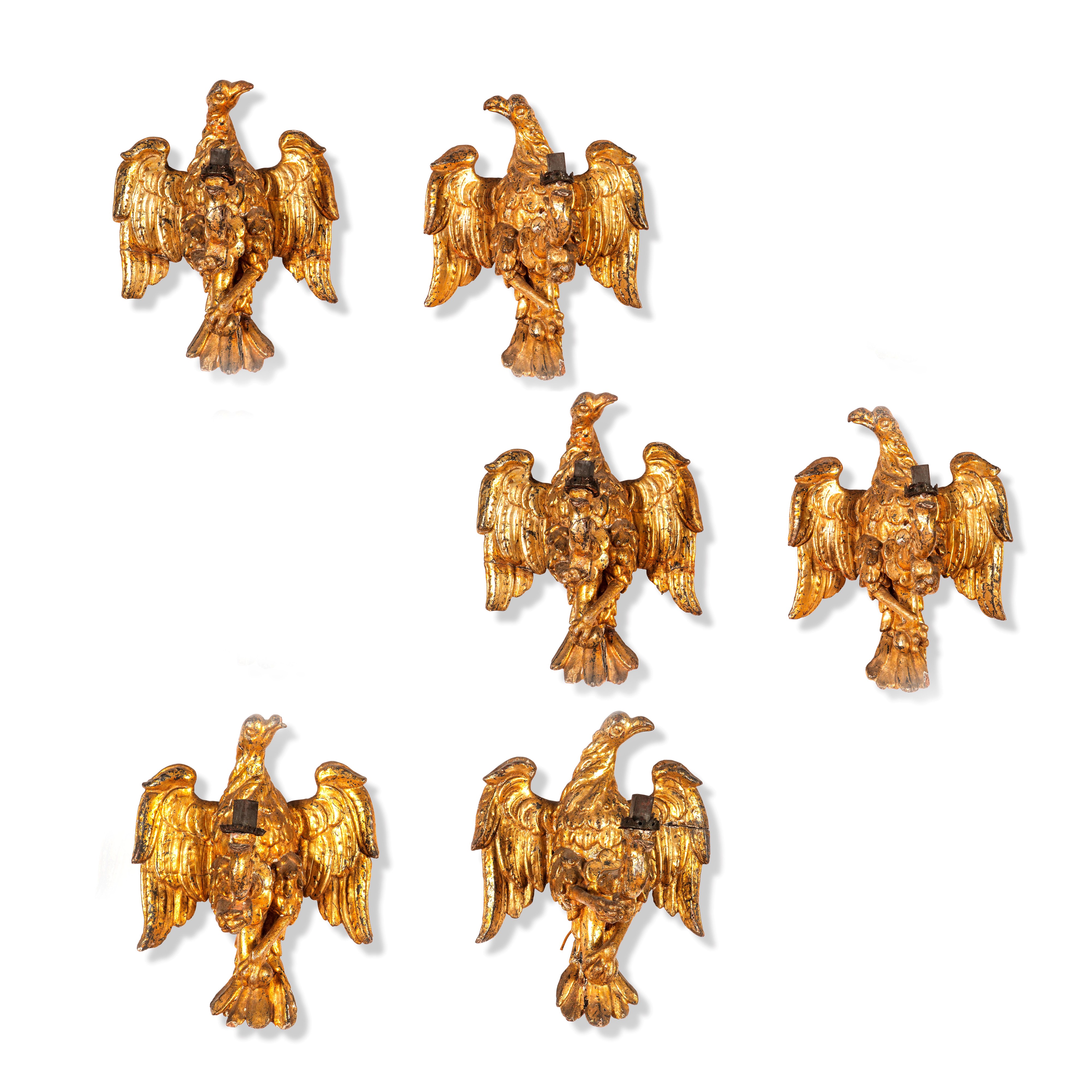Legno scolpito e dorato a foggia di aquila, la cui zampa sporge a formare il braccio reggicandela