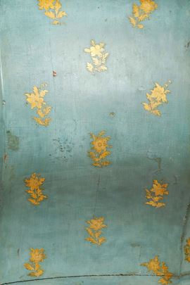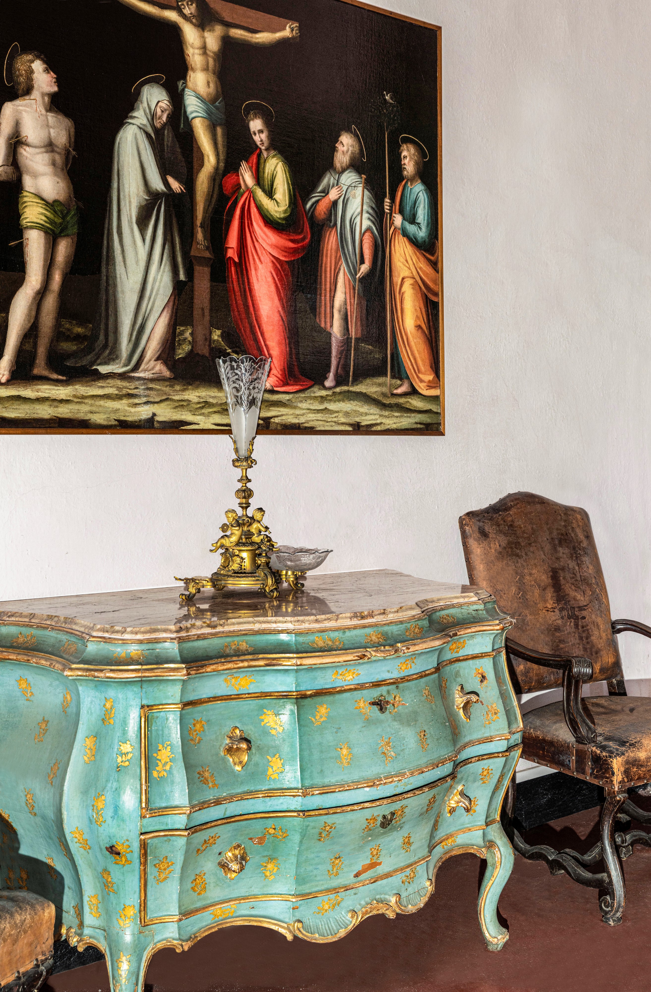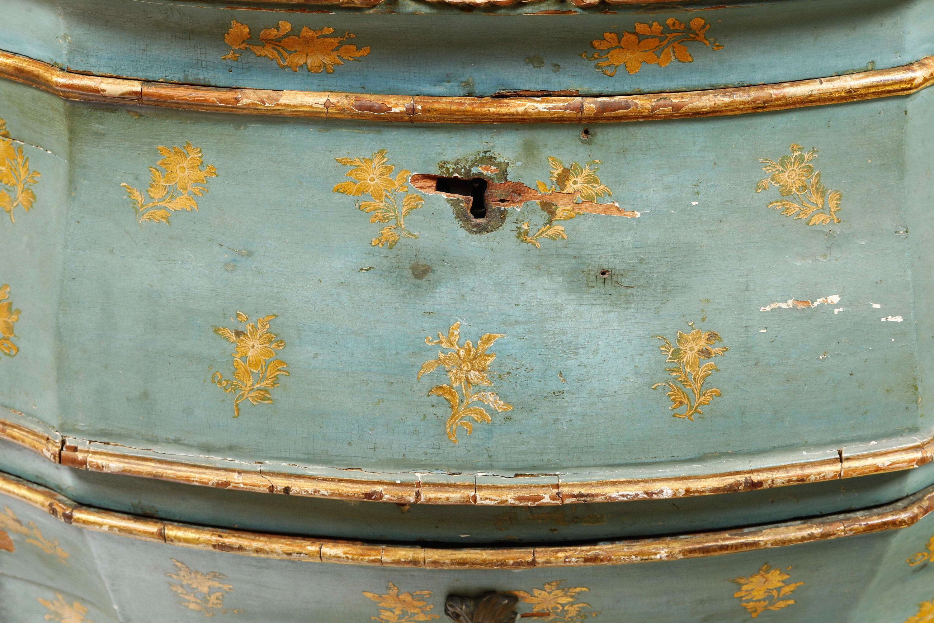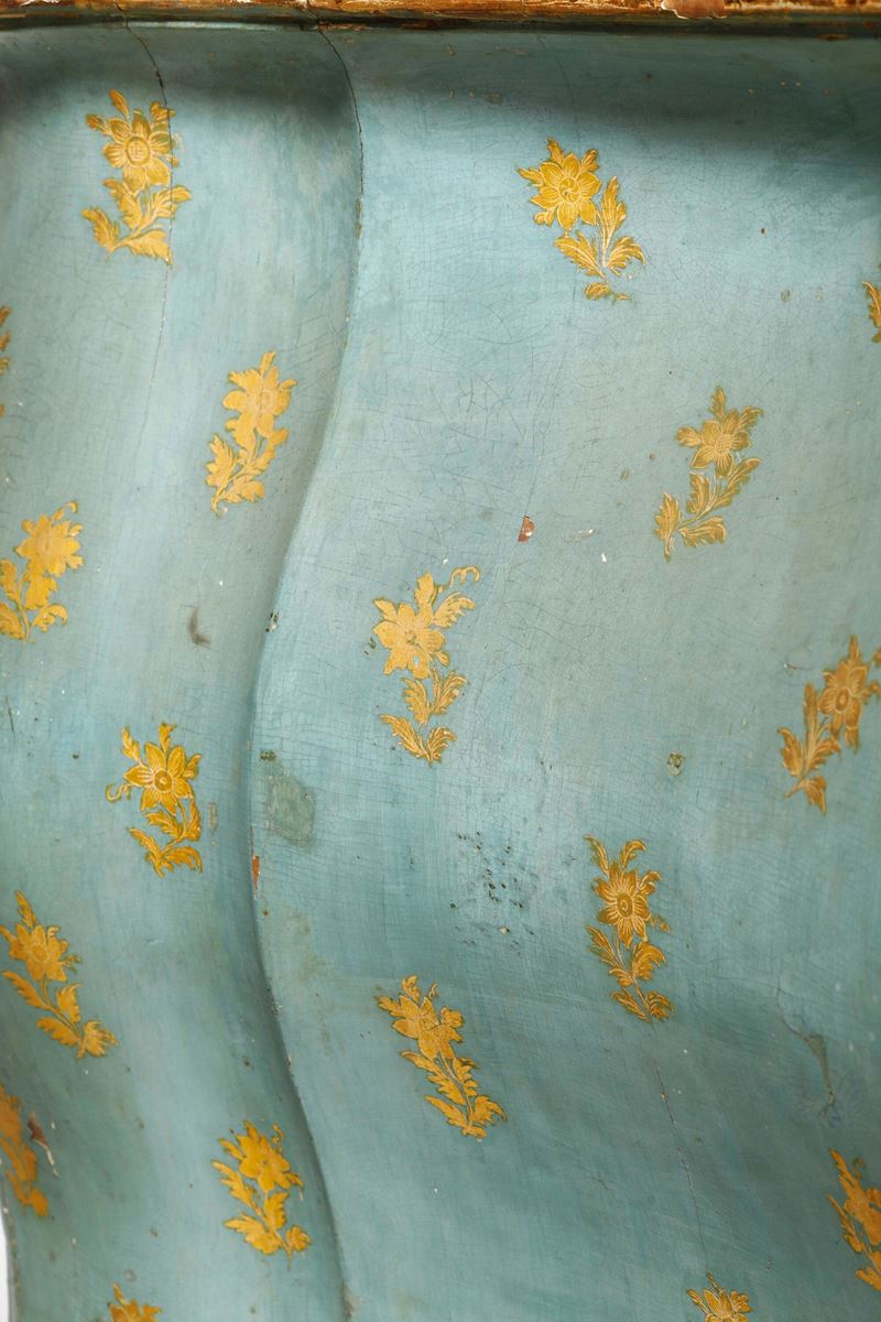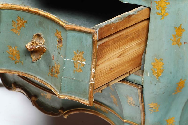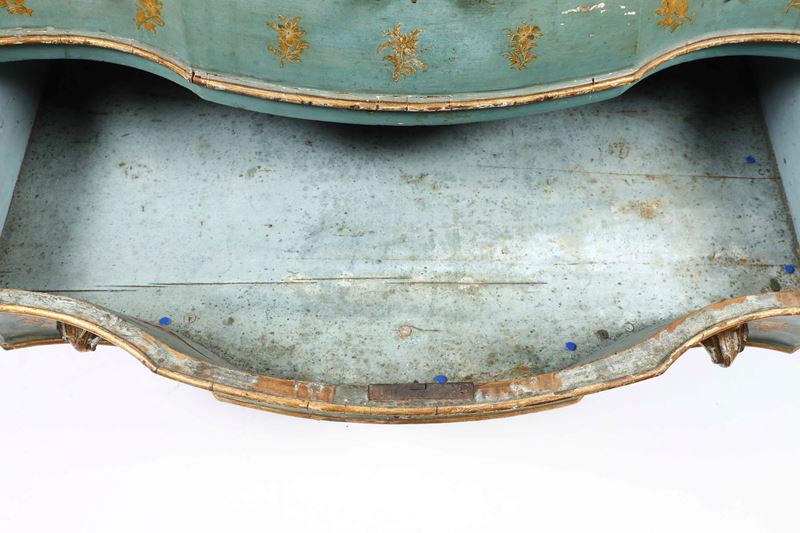 Lacca verde-azzurro con decorazione a mazzetti di fiori dorati, cassetti e profili evidenziati dalle tipiche cornicette scolpite e dorate, fronte a due cassetti con maniglie in legno intagliato a foggia di foglie. Fronte, fianchi e montanti dalle linee marcatamente spezzate e bombate, su cui si innestano gambe ad "s", pendaglina sagomata e arricchita da intagli a rocaille. Piano in marmo sagomato e incassato