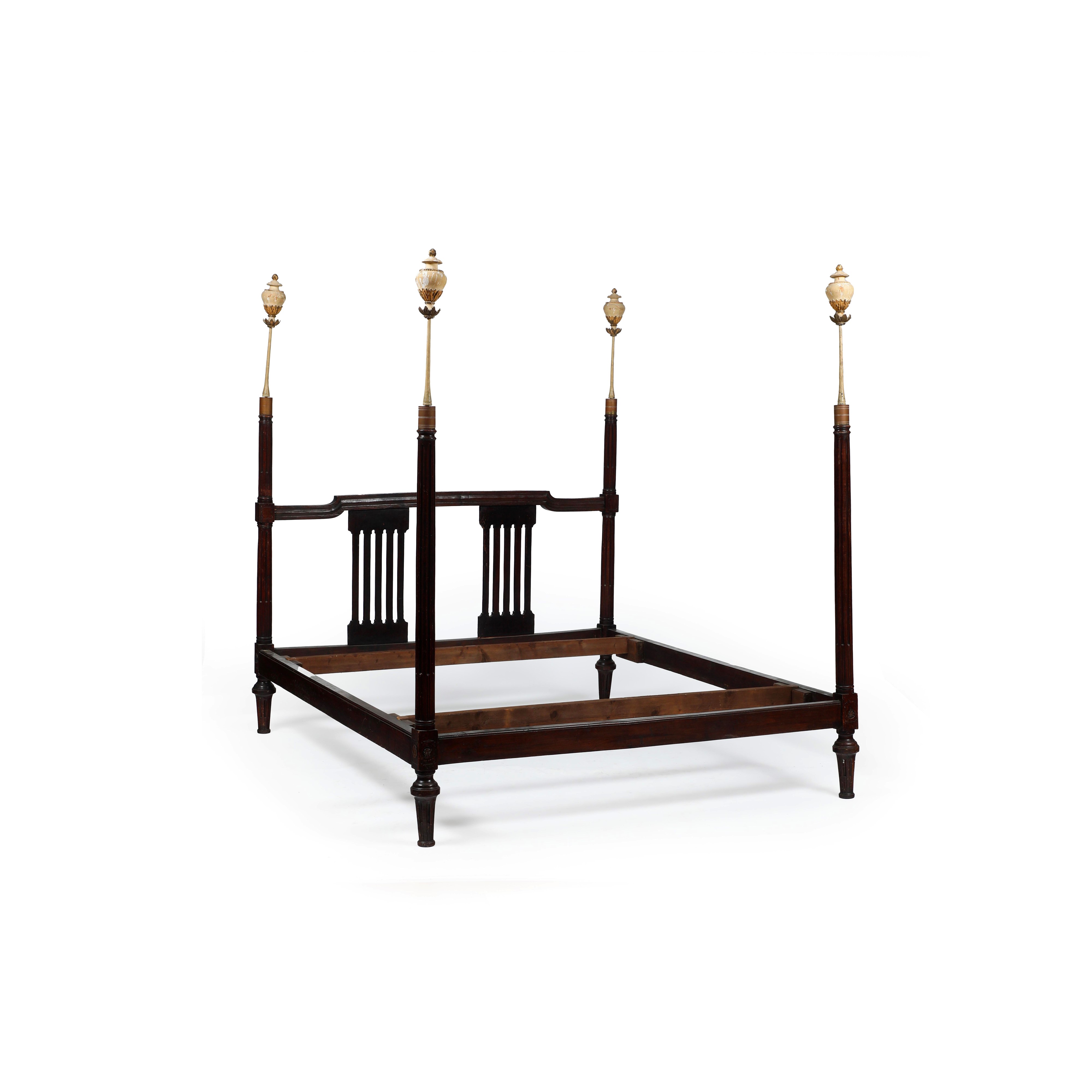 Legno intagliato. Montanti a colonna scanalata con terminali torniti, laccati e dorati, testiera traforata
