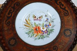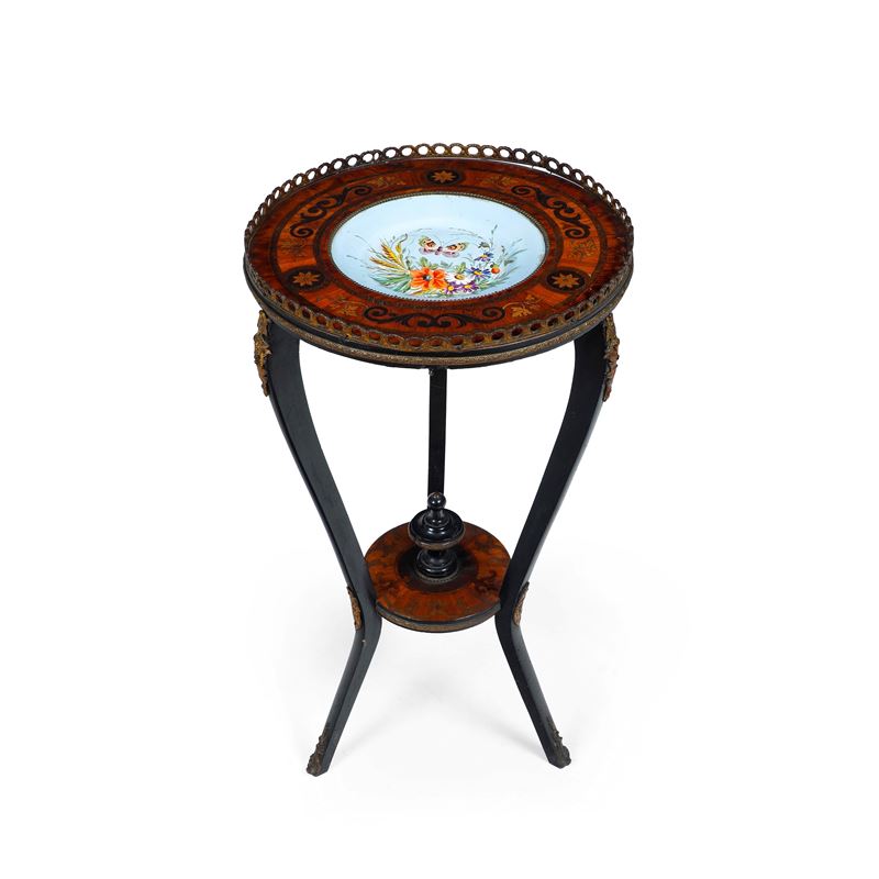 Legno intarsiato. Piano con piatto centrale in porcellana con decoro floreale contornato da intarsi a volute e motivi fitomorfi, ringhierina in metallo dorato, gambe mosse ed ebanizzate riunite da pianetto tondo