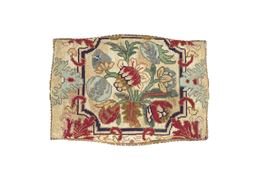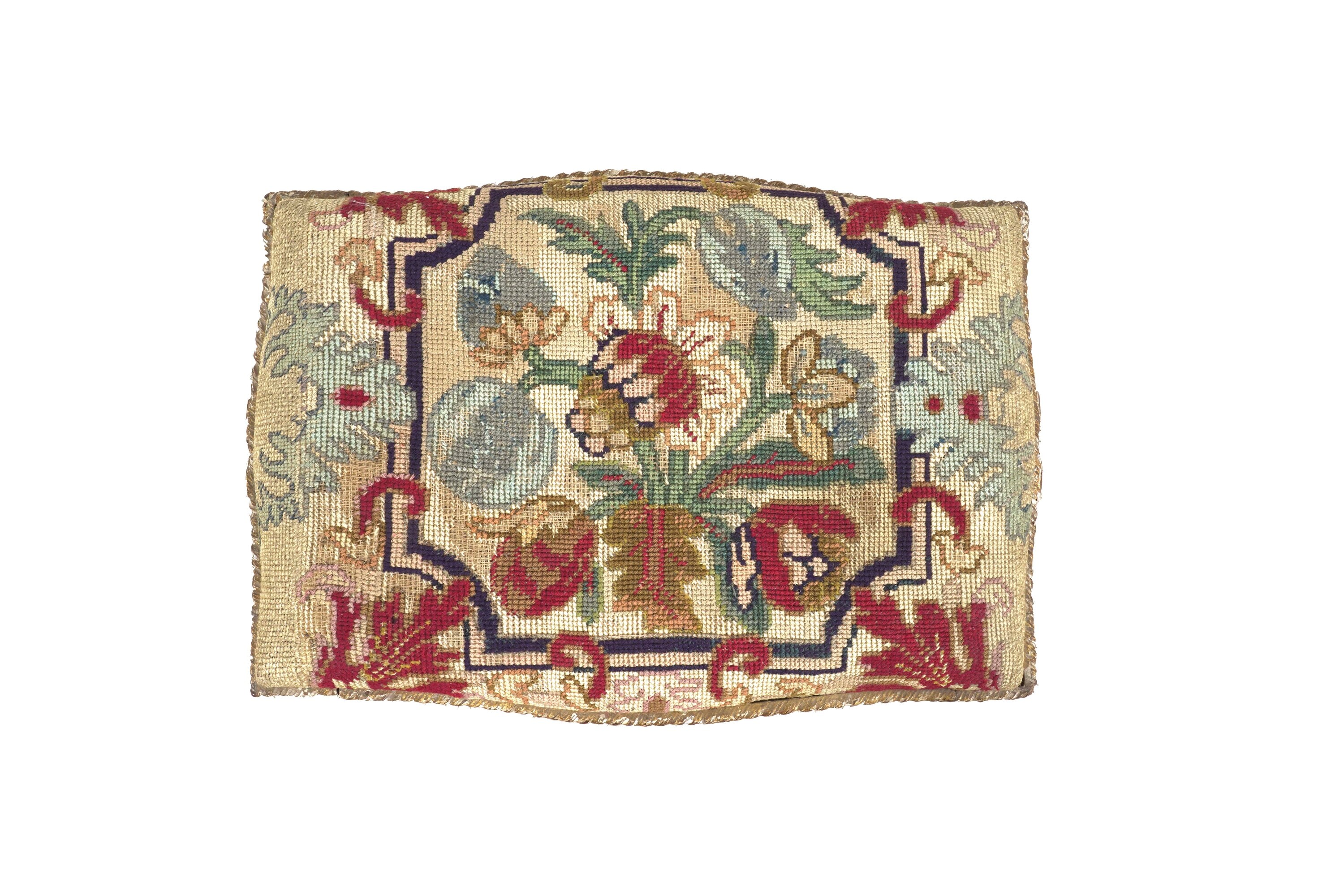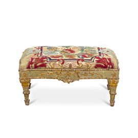 Legno intagliato, laccato e dorato. Piedi rastremati, decoro a motivi fitomorfi, rivestito con tessuto ricamato a motivi floreali