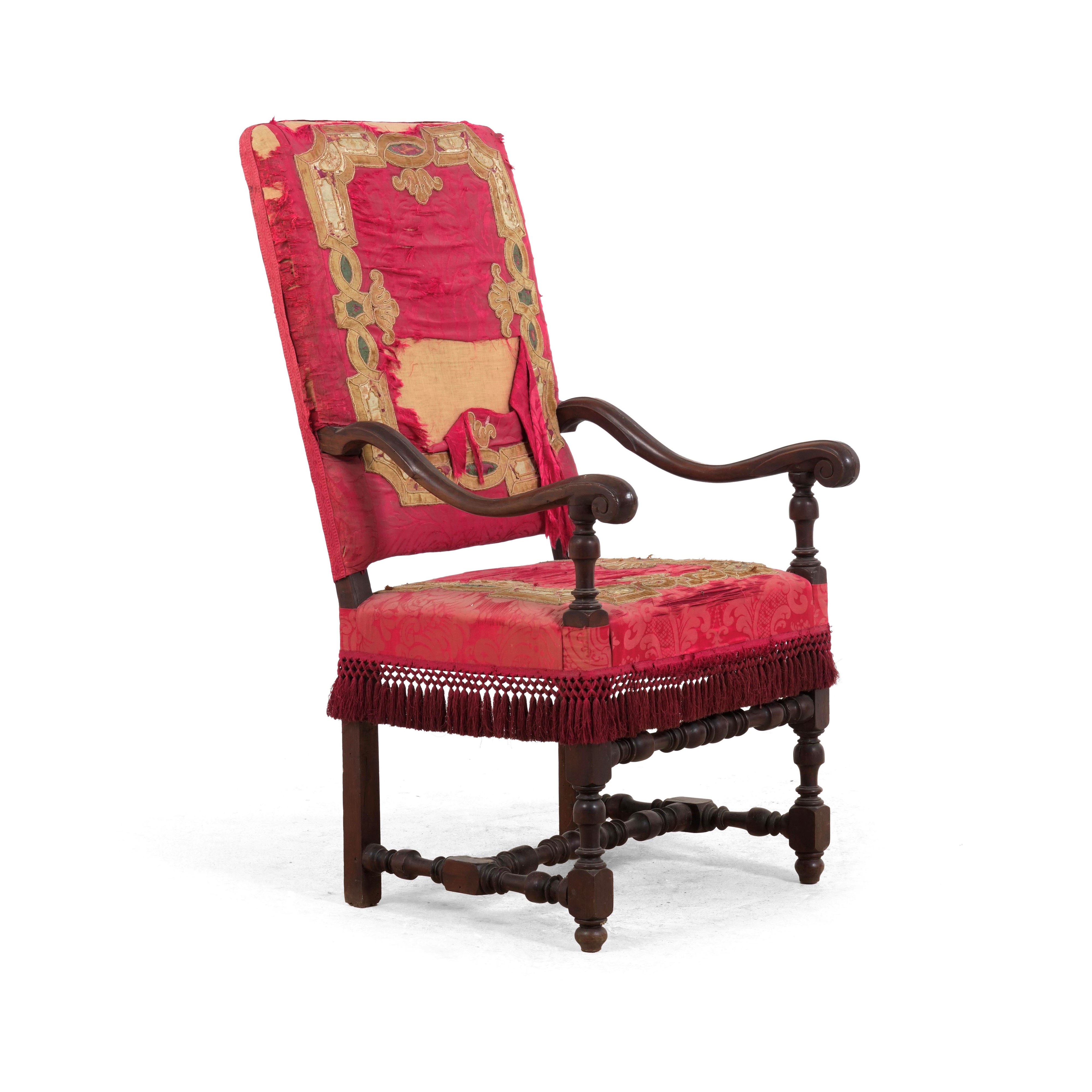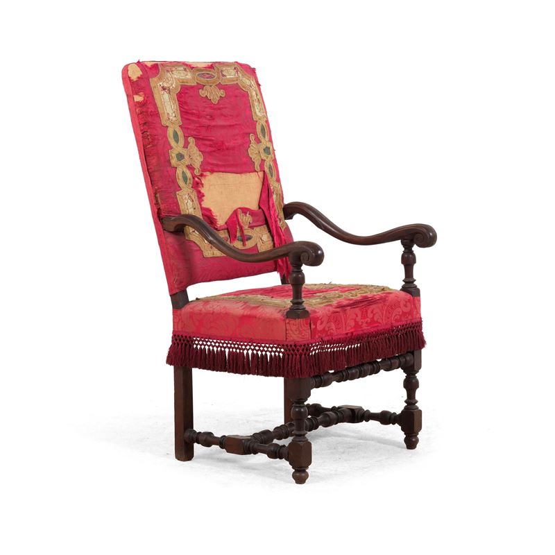 Braccioli intagliati e mossi, gambe a rocchetto, rivestita con antico tessuto damascato a riporti