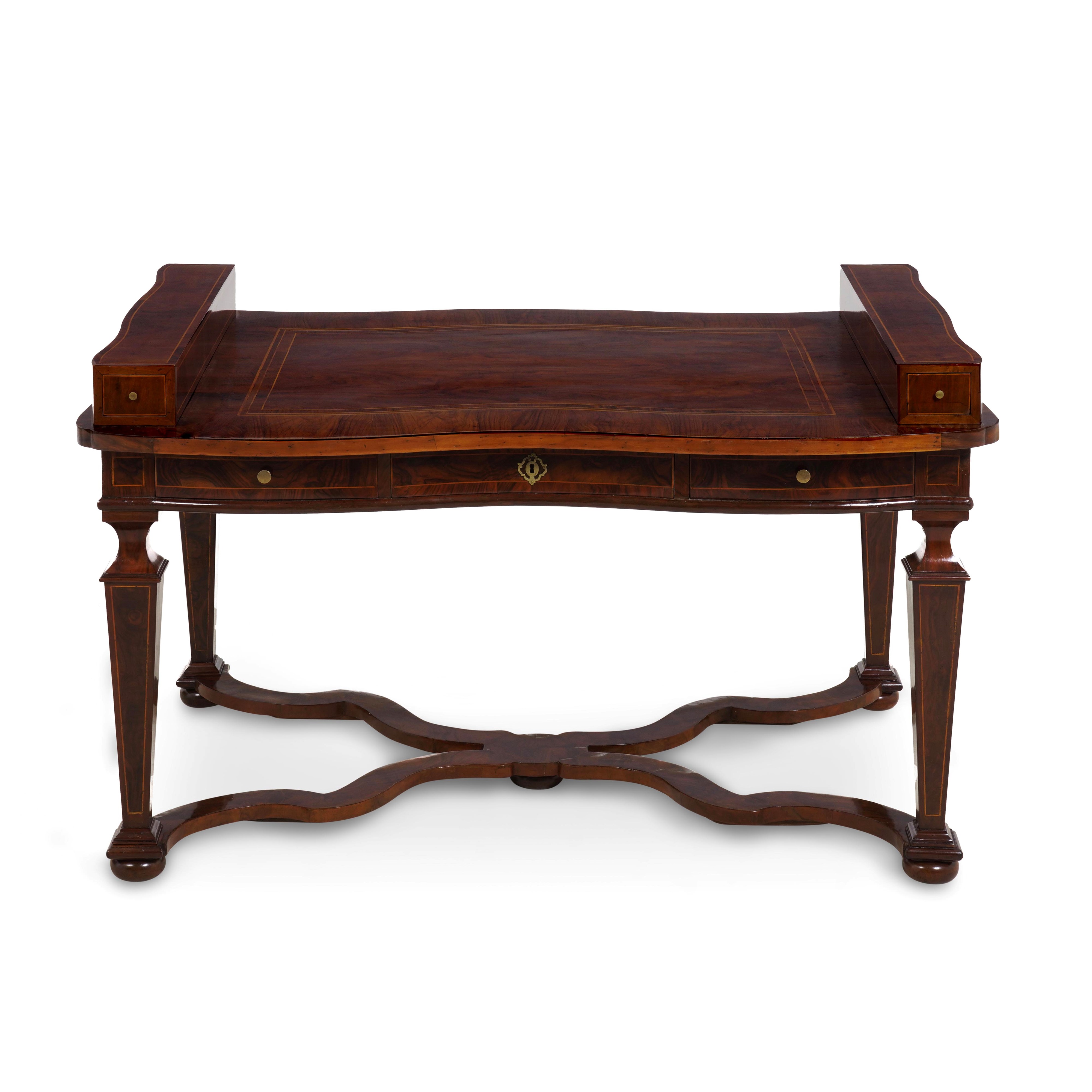 Lastronato in noce e radica, filettato in legno chiaro, tre cassetti sotto il piano sagomato, due cassettini sui montanti, gambe trocopiramidali riunite da crociera