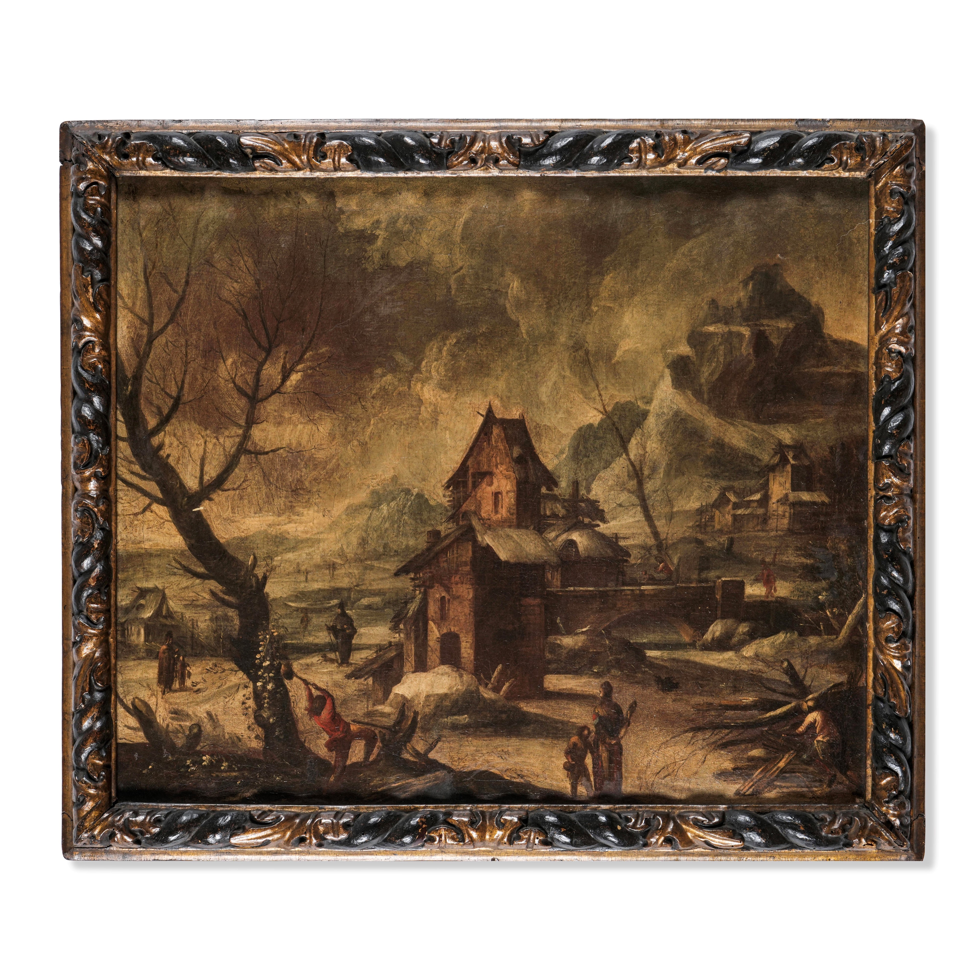 Scuola del XVII secolo Paesaggio invernale con contadini
