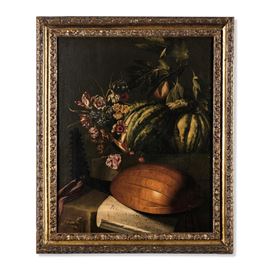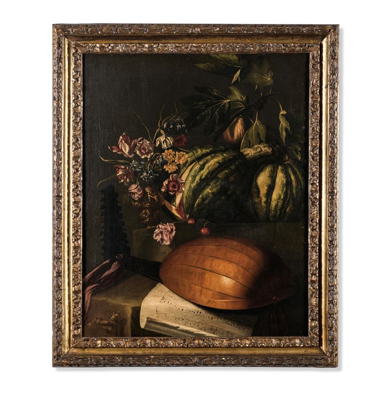 Scuola del XVIII secolo Natura morta con zucca, fiori, liuto e spartito