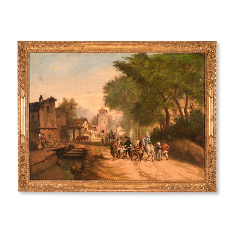 Scuola lombarda del XIX secolo Veduta di villaggio con popolani