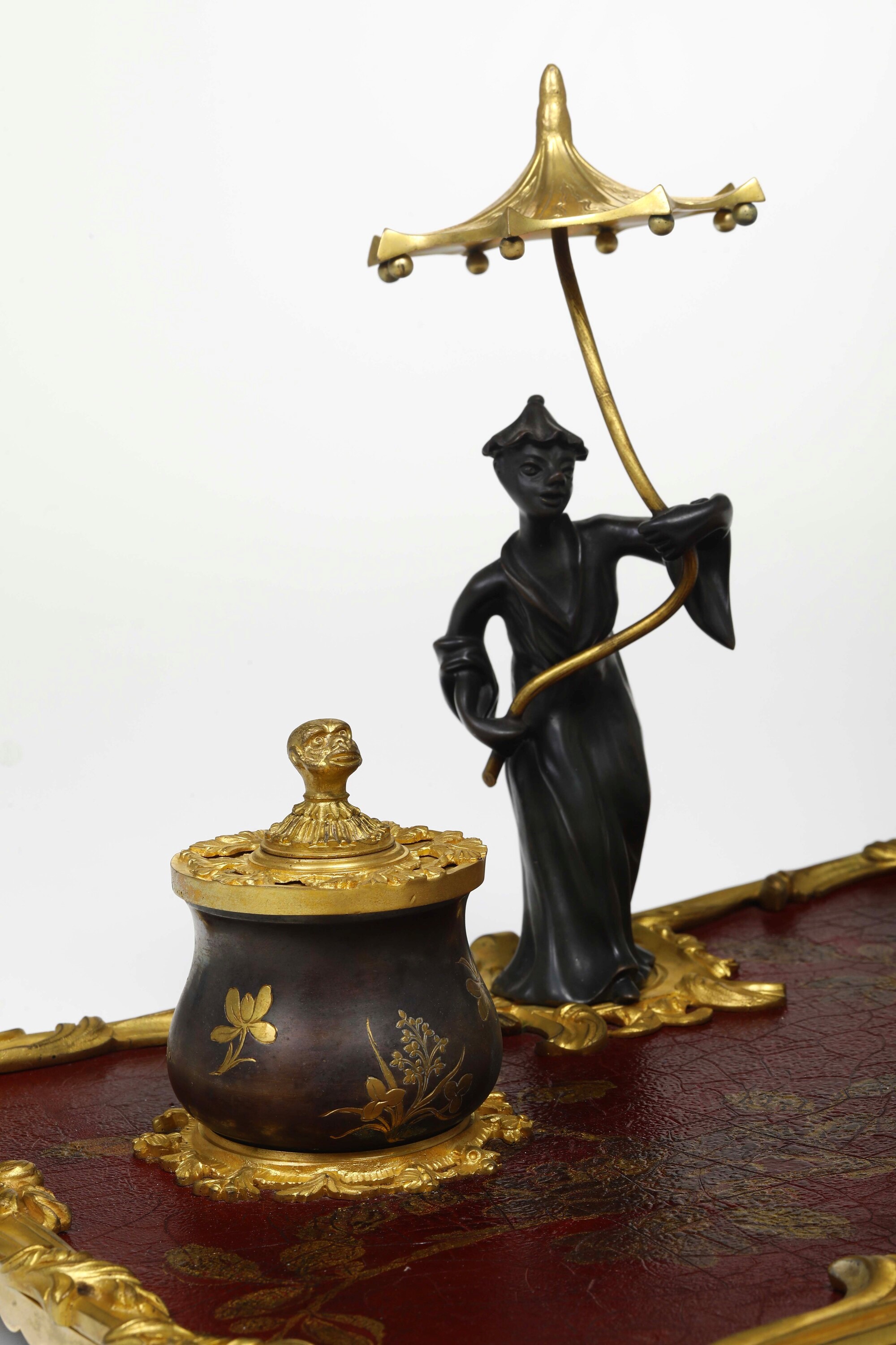 Bronzo cesellato, dorato e brunito, decoro a chinoiserie in lacca rossa e oro. Due recipienti con tappi in forma di teste di scimmie incorniciano un personaggio orientale che regge un ombrello. Piedi a volute