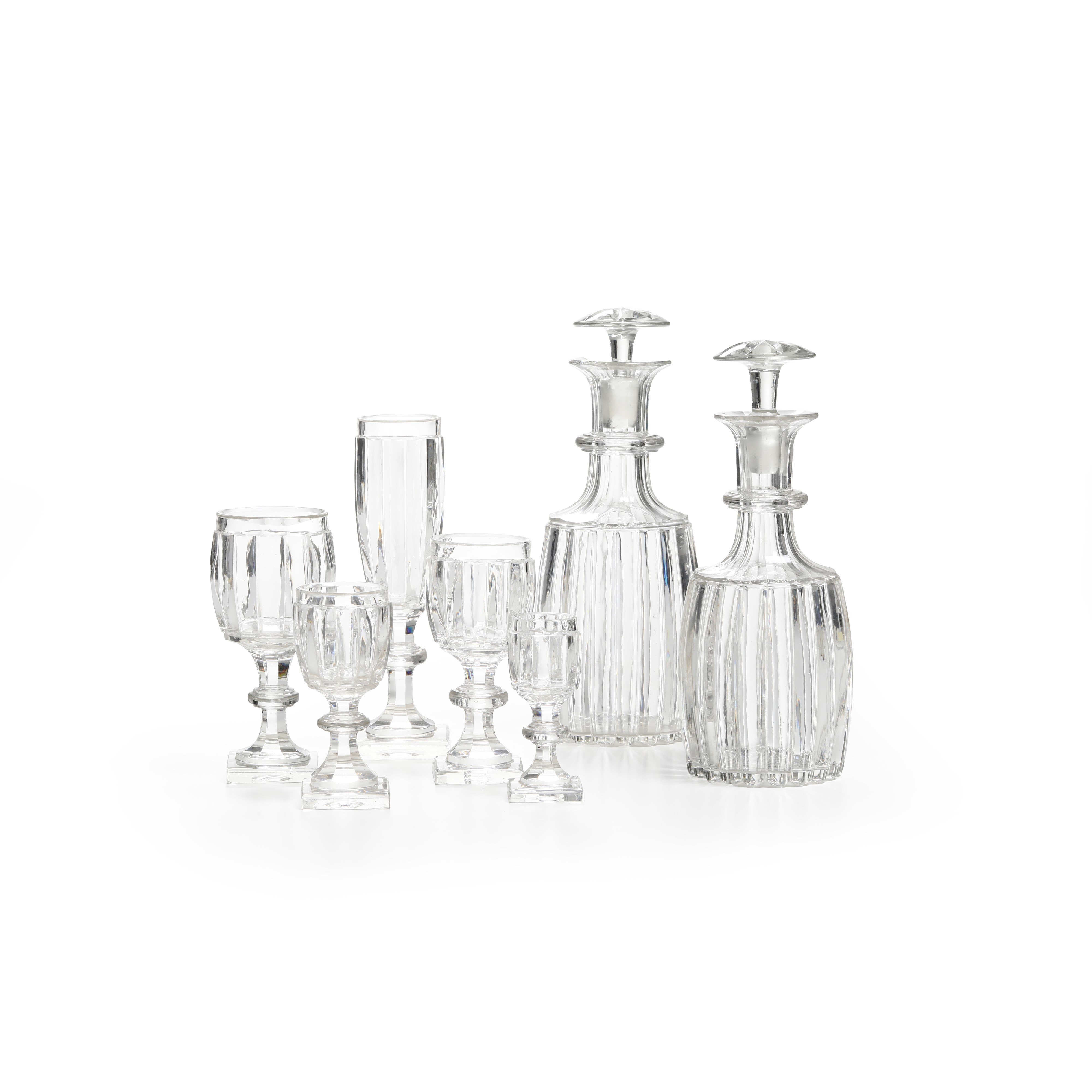Il servizio conta 131 pezzi ed è così composto: 27 calici da acqua; 20 calici da vino; 19 calici da rosolio; 26 calici da liquore; 18 flûtes; 8 bottiglie senza tappo; 13 bottiglie con tappo