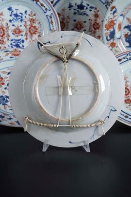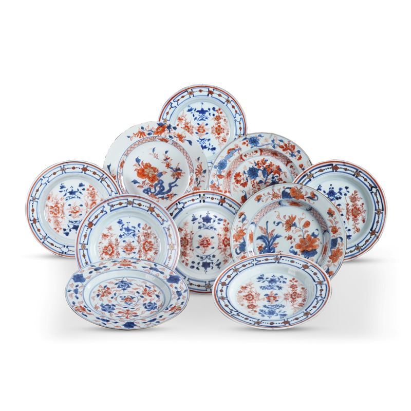Servizio in porcellana composto da dieci piatti stile Imari con decori floreali, Giappone, XIX secolo