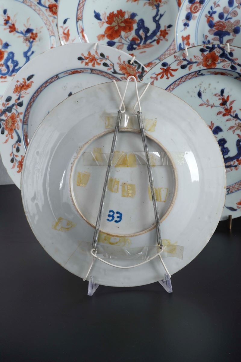 Servizio in porcellana composto da dieci piatti stile Imari con decori floreali, Giappone, XIX secolo