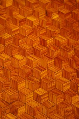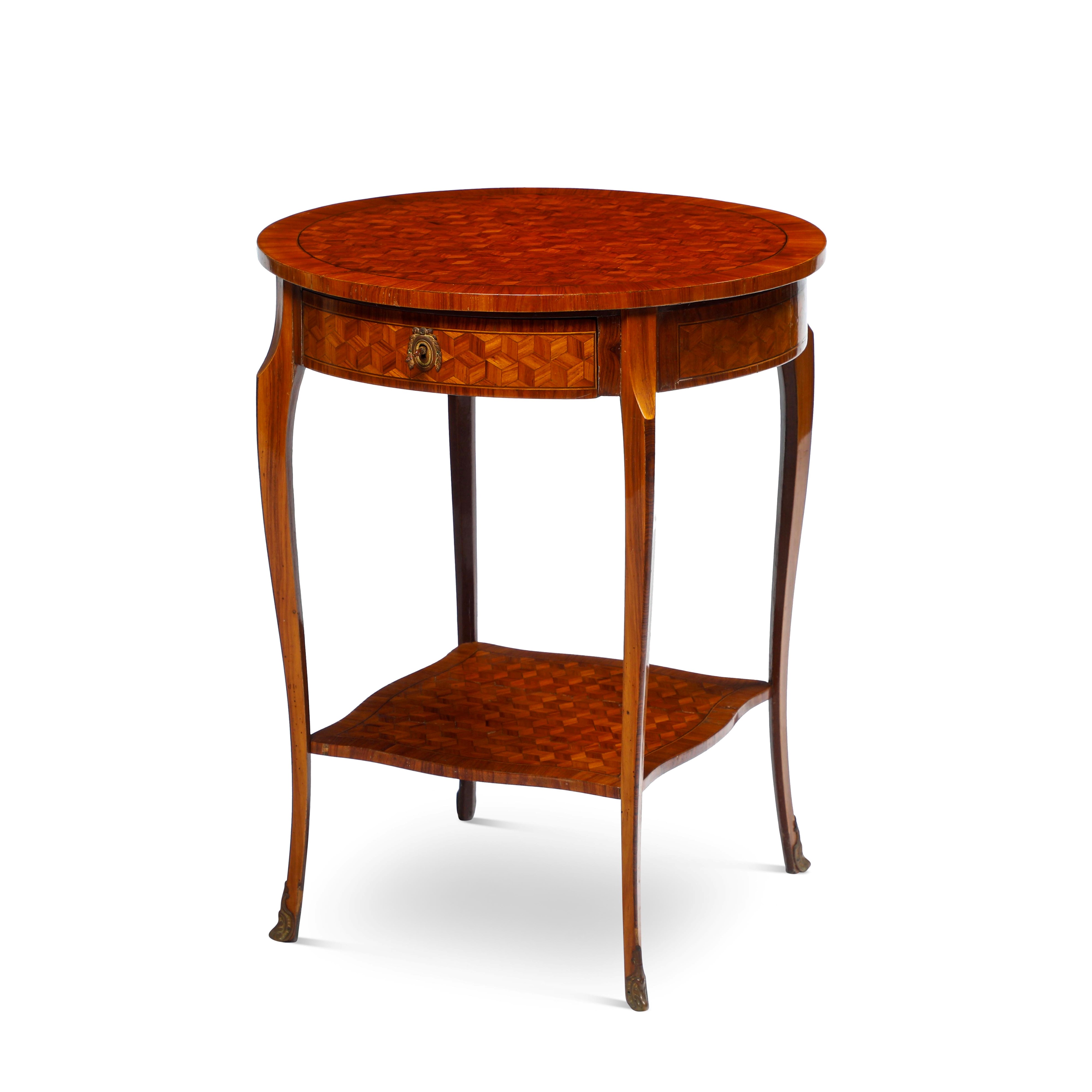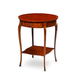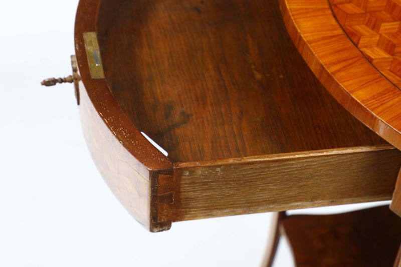 Lastronato a motivi geometrici. Un cassetto nella fascia, pianetto basso di raccordo sagomato, gambe mosse