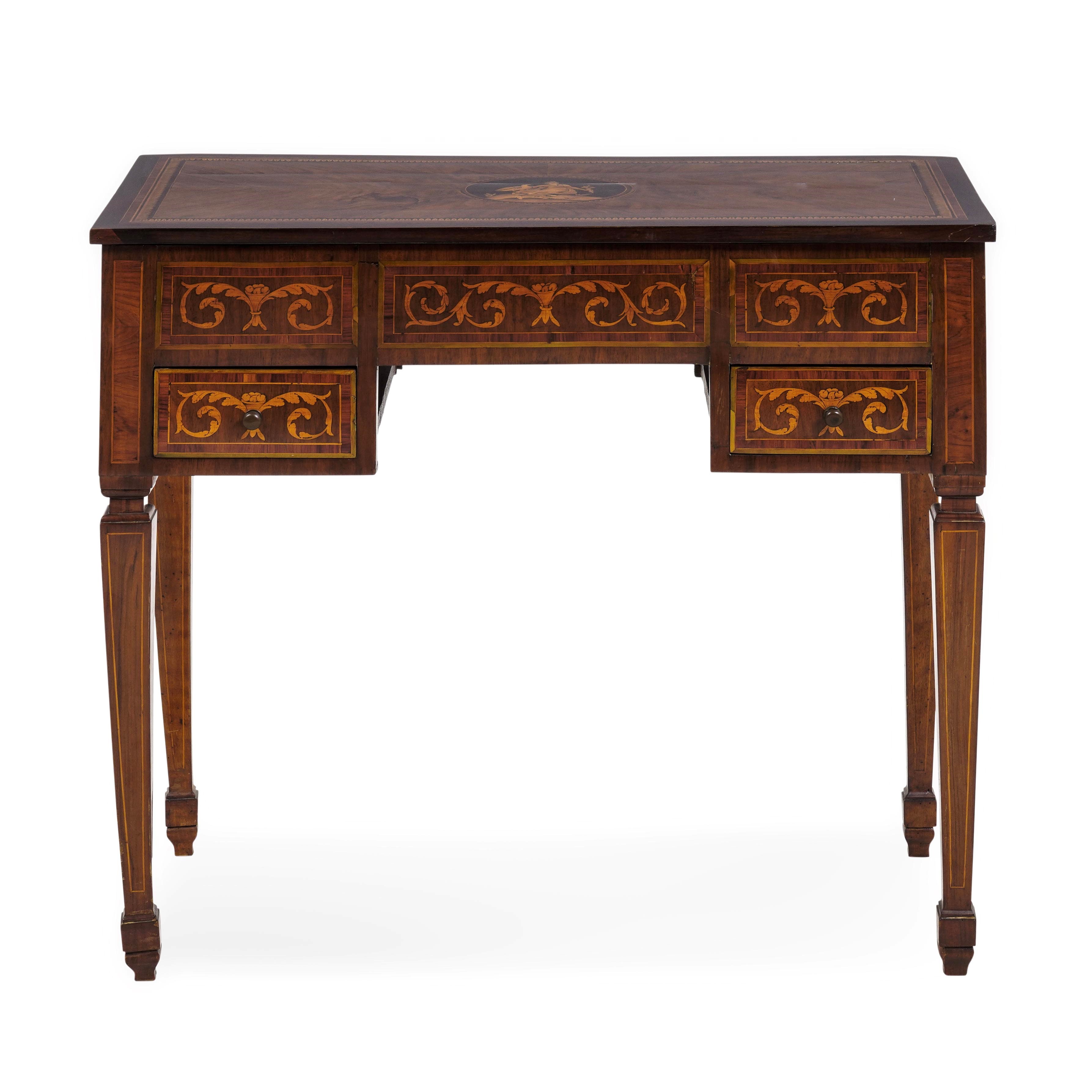 Decoro a intarsio con figura figura femminile al centro del piano e a volute nella fascia. Piano apribile incernierato, due cassettini laterali nella fascia, gambe rastremate
