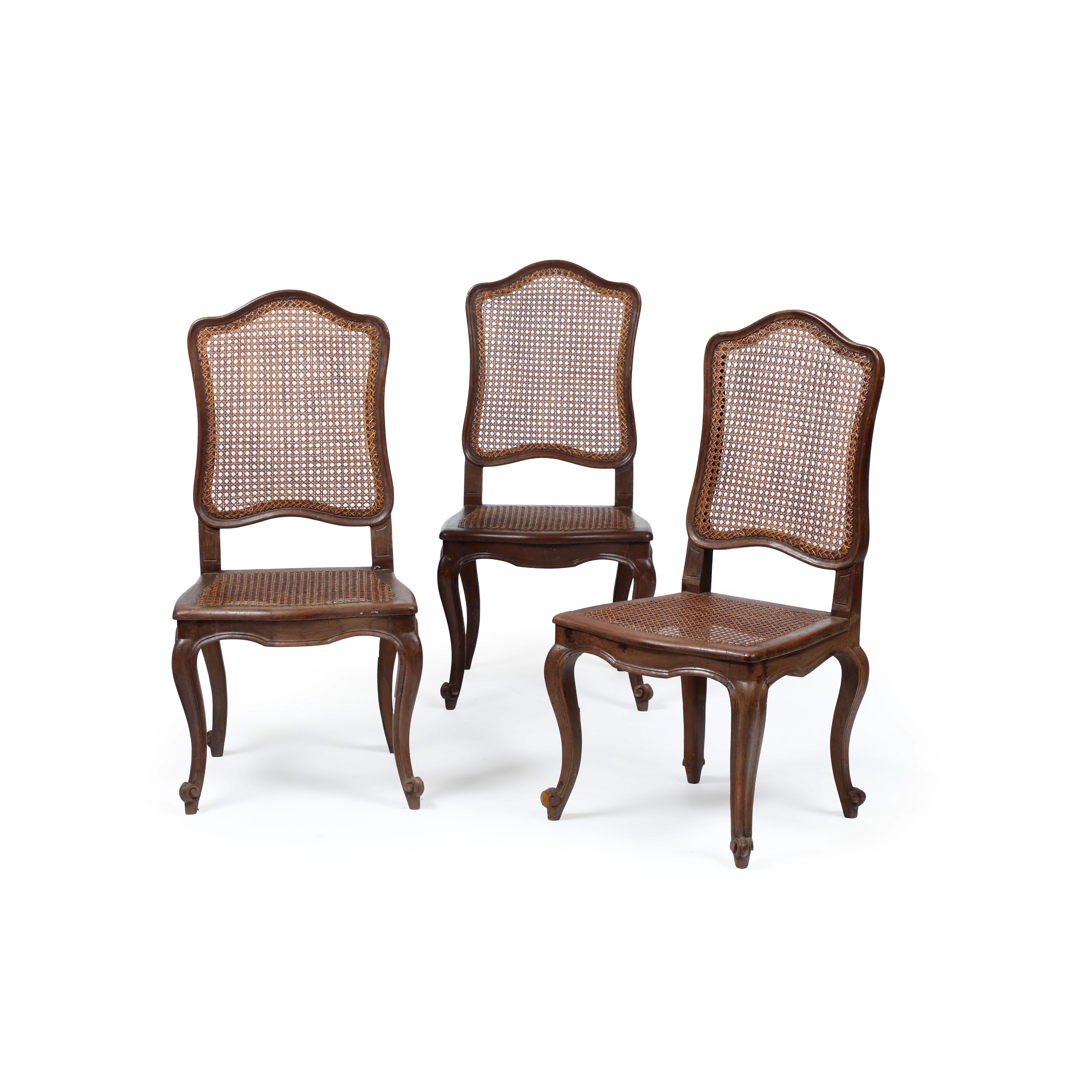 Legno intagliato con sedute e schienali in cannetè. Schienale sagomato, gambe mosse terminanti a volute