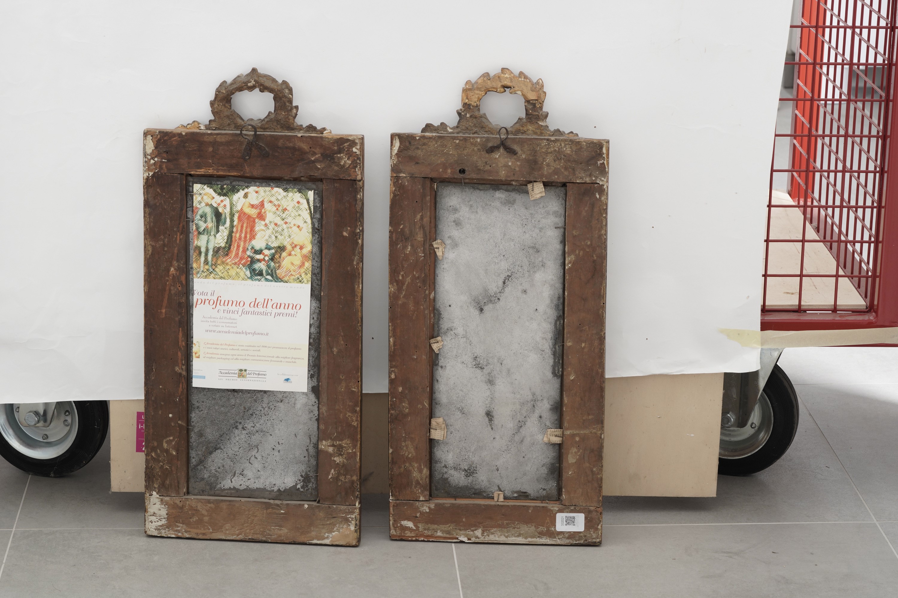 Coppia di piccole specchiere in legno laccato e dorato, Italia centrale, XIX secolo