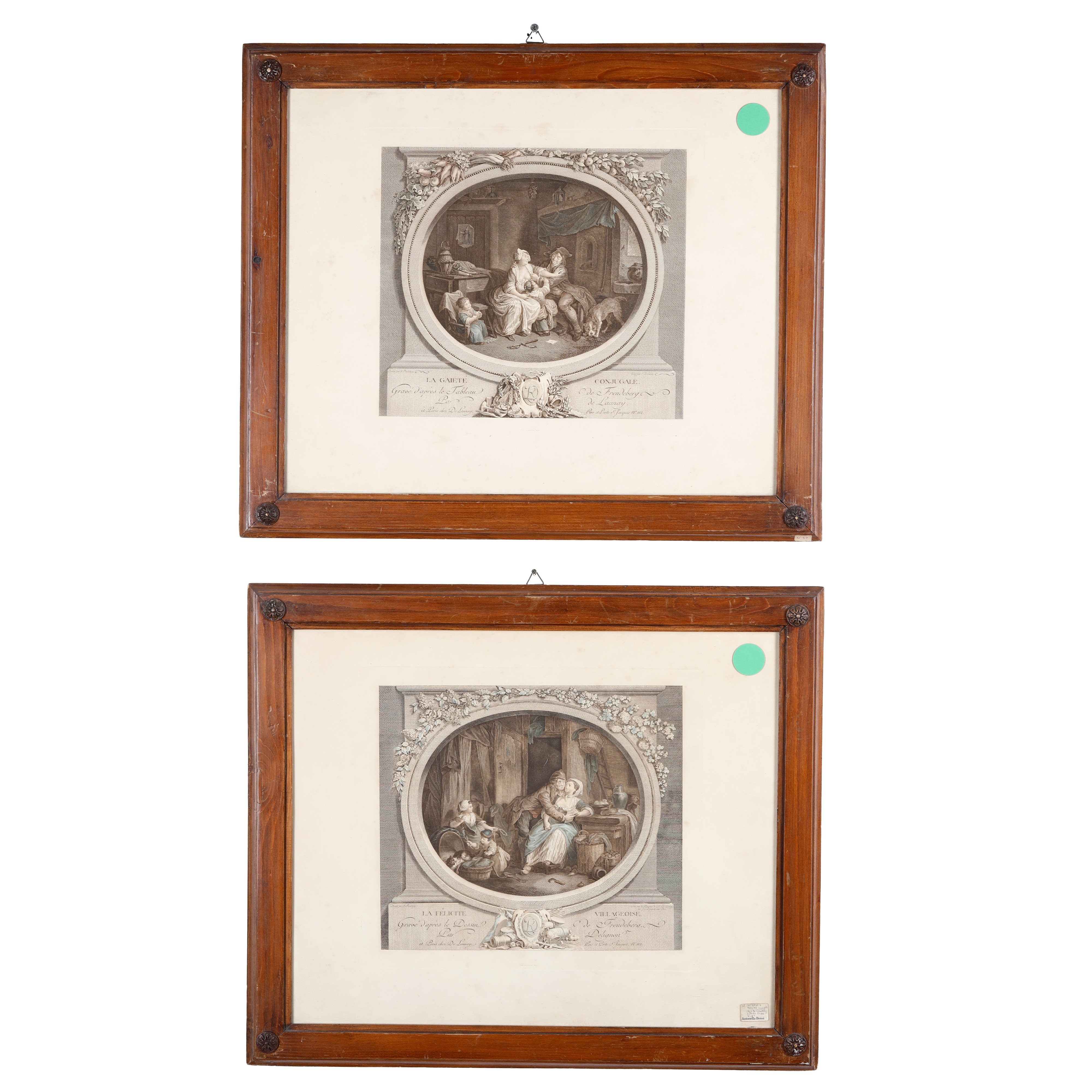 Coppia di stampe colorate con scene galanti, Francia XVIII-XIX secolo