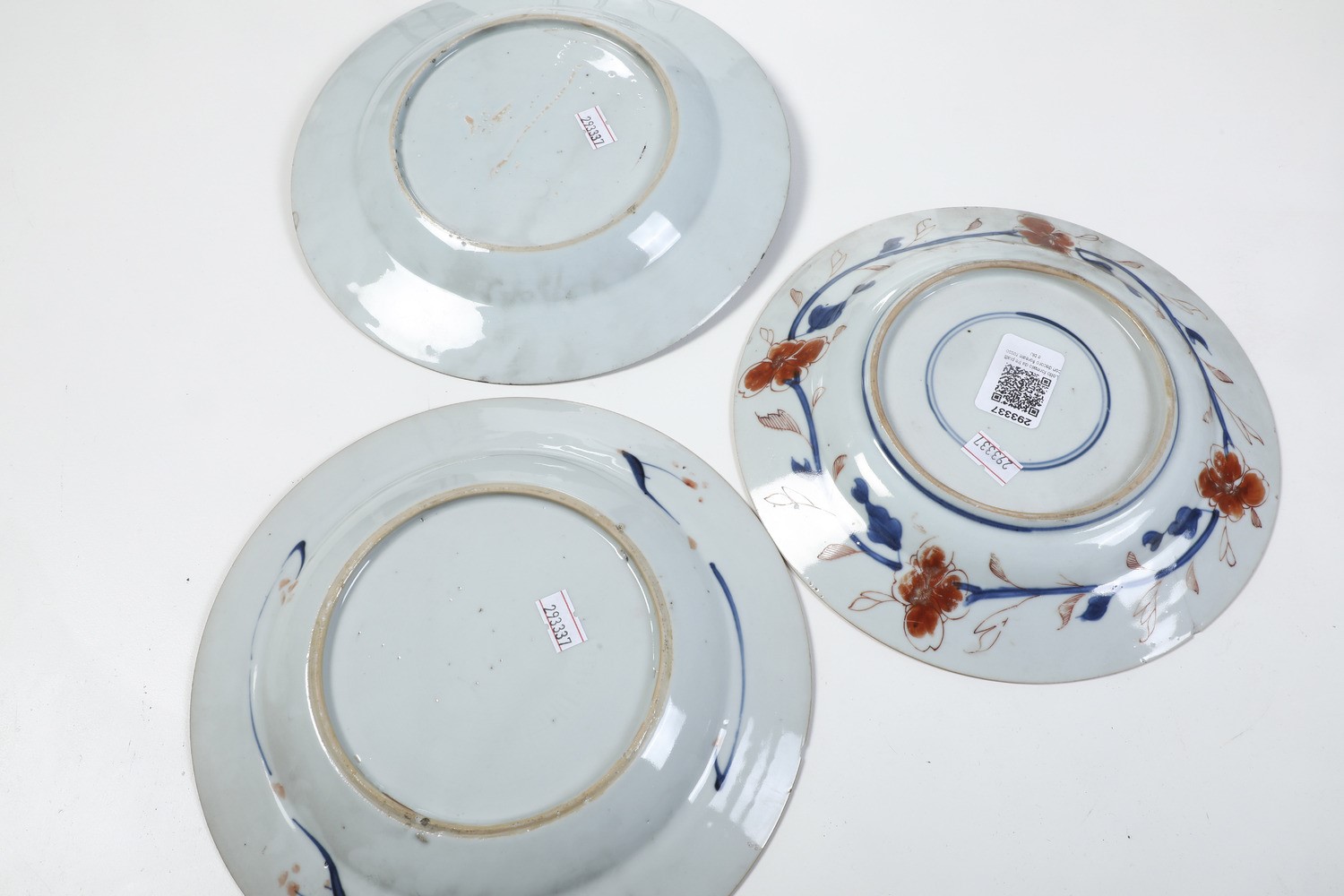 Lotto composto da tre piatti in porcellana Imari con decori floreali, Cina, Dinastia Qing, XIX secolo