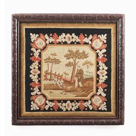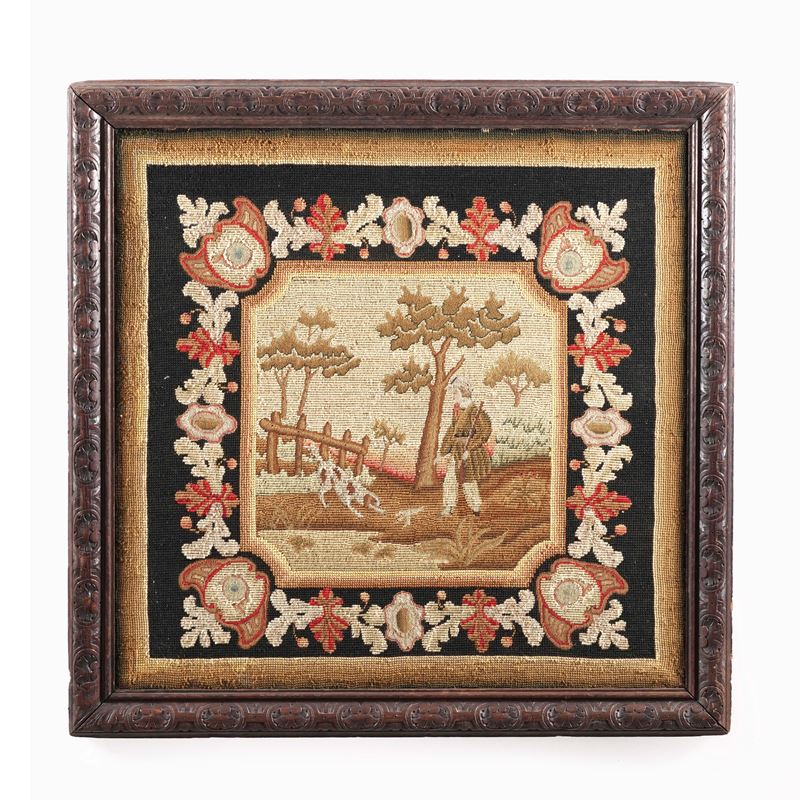 Pannello ricamato a piccolo punto con scene di caccia. XIX secolo