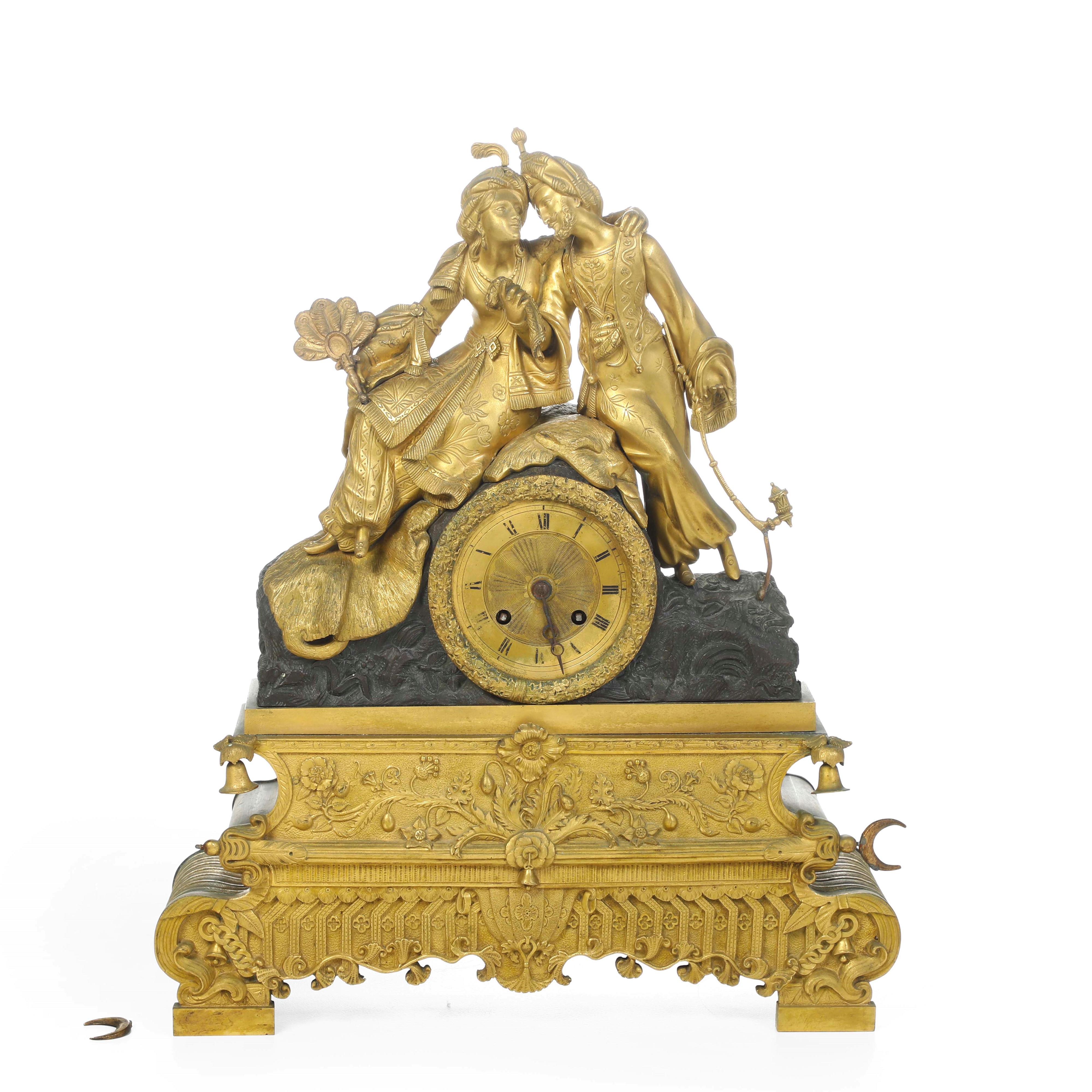 Cassa con decori floreali, cimasa con coppia di figure un abiti orientaleggianti, quadrante dorato con numeri romani, contornato a ghirlanda