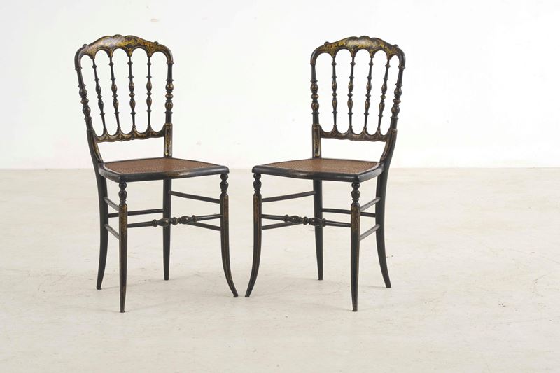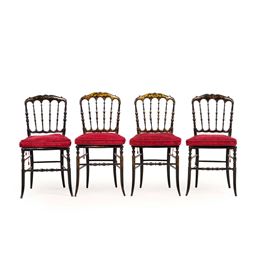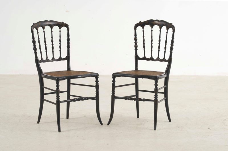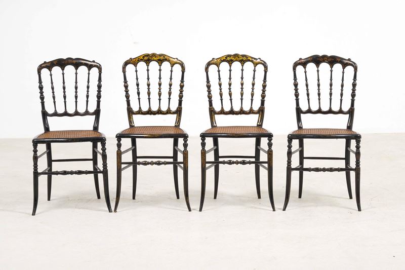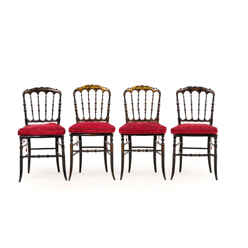 Quattro sedie chiavarine in legno ebanizzato con decori dorati