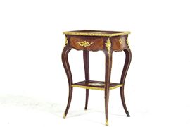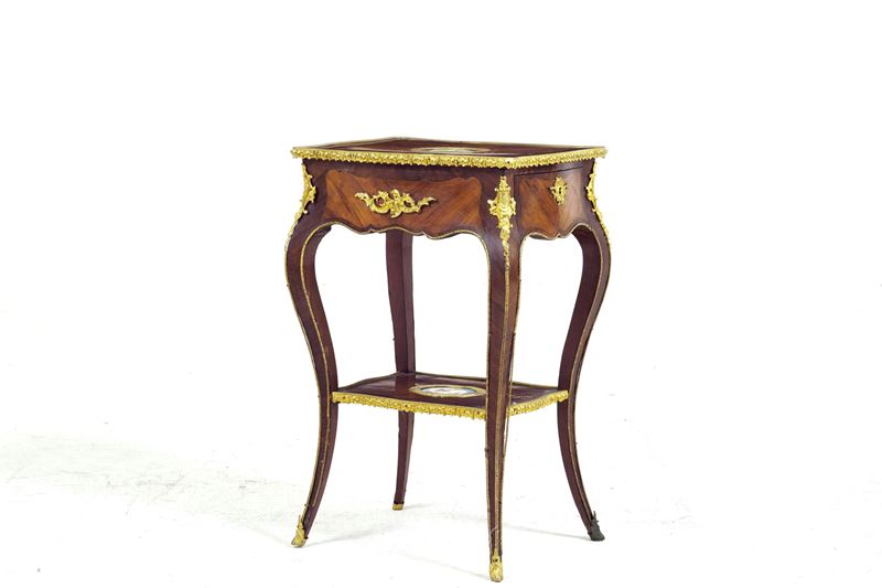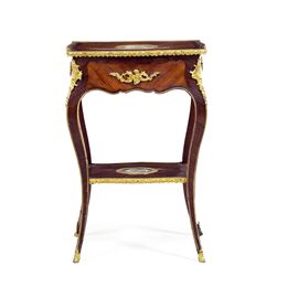 Tavolino da lavoro di gusto Luigi XV lastronato in bois de rose e palissandro, Francia, XIX-XX secolo