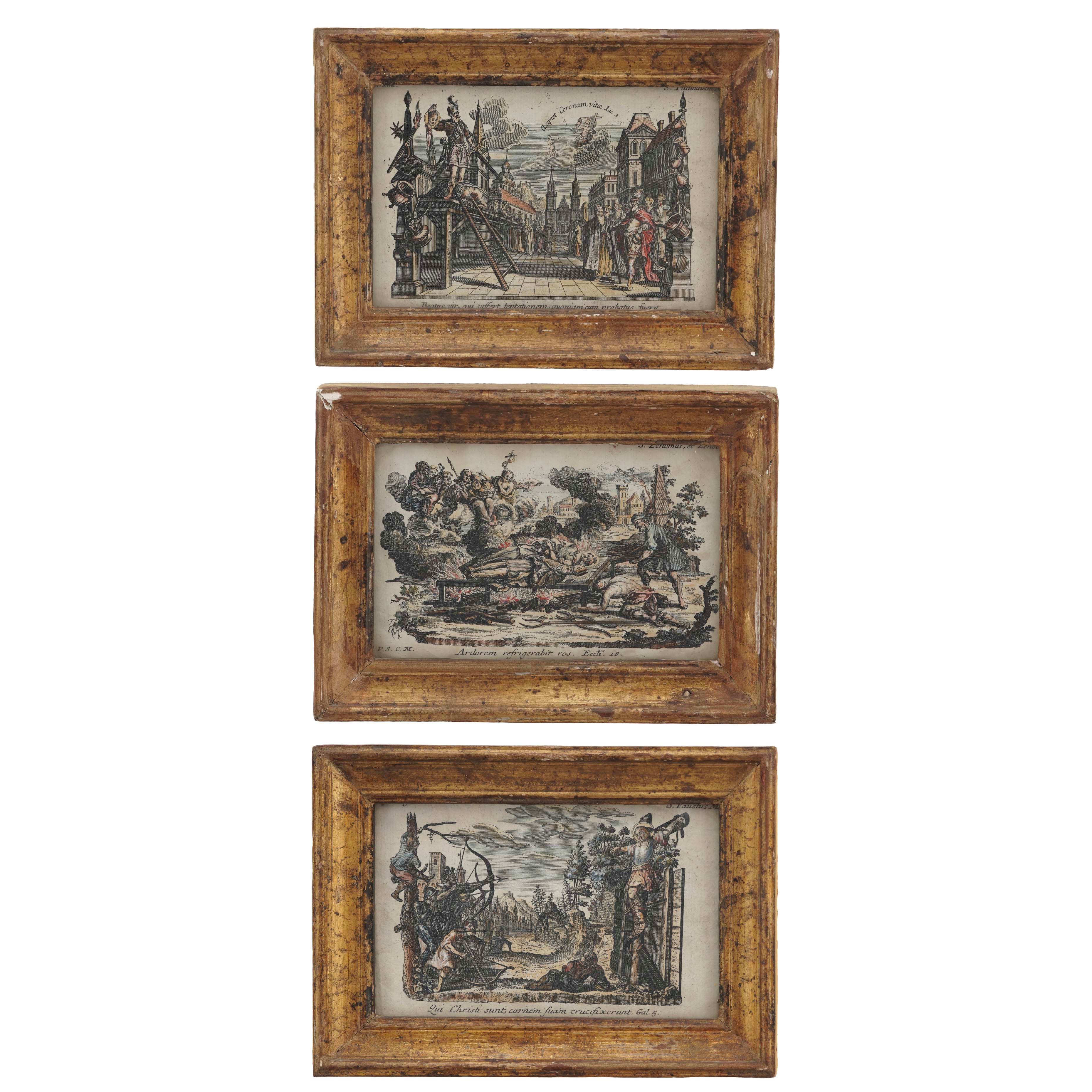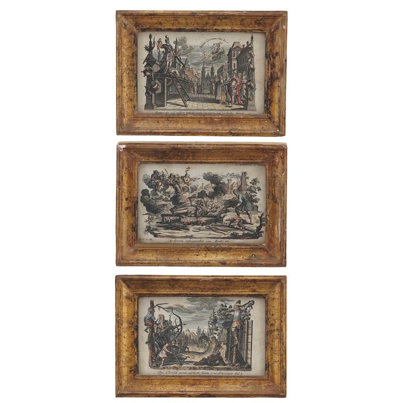 Tre piccole incisioni colorate con scene di martiri di Santi. XVIII secolo