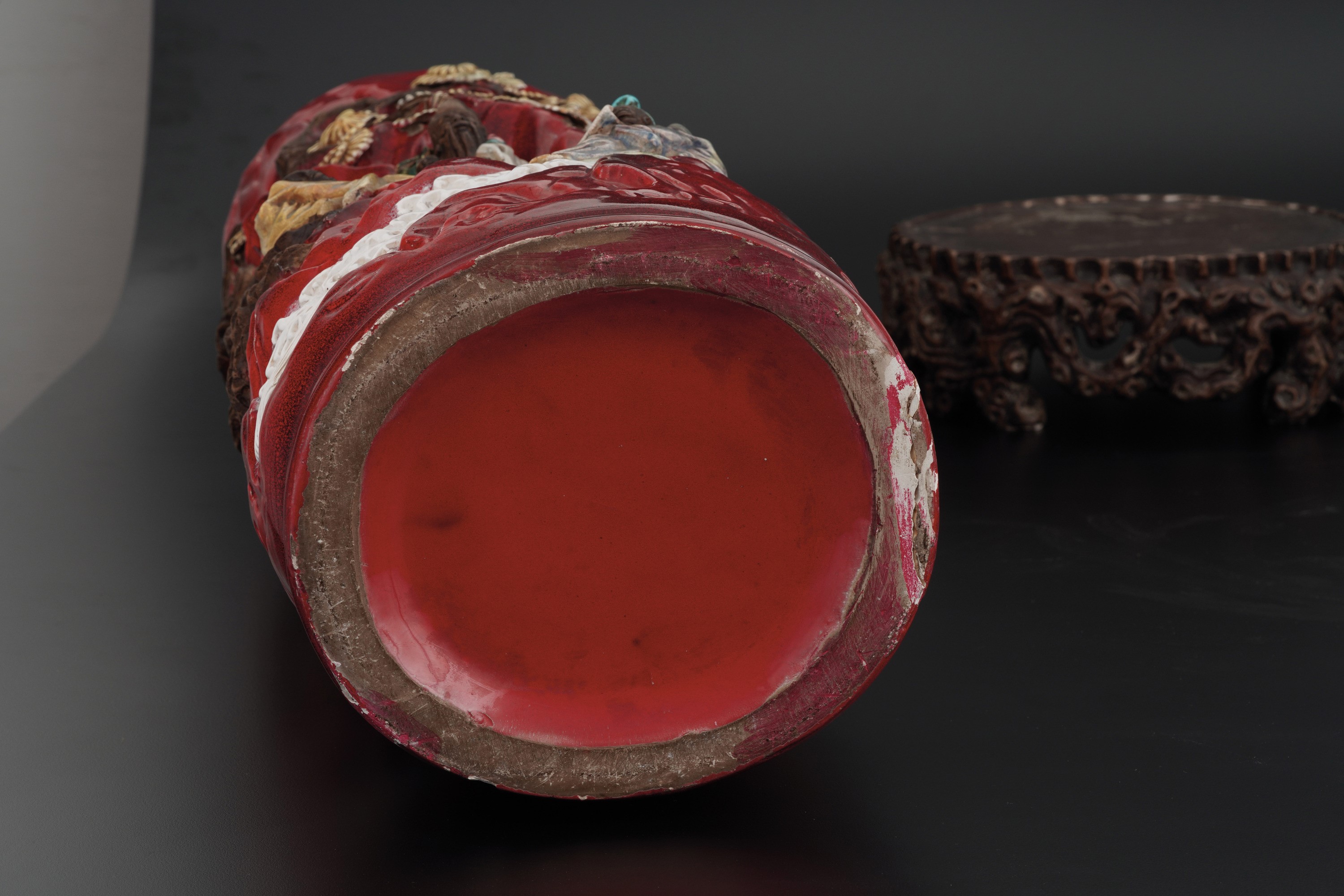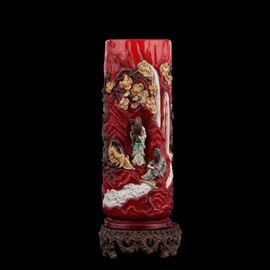 Vaso orientale in porcellana a smalti policromi con figure a rilievo