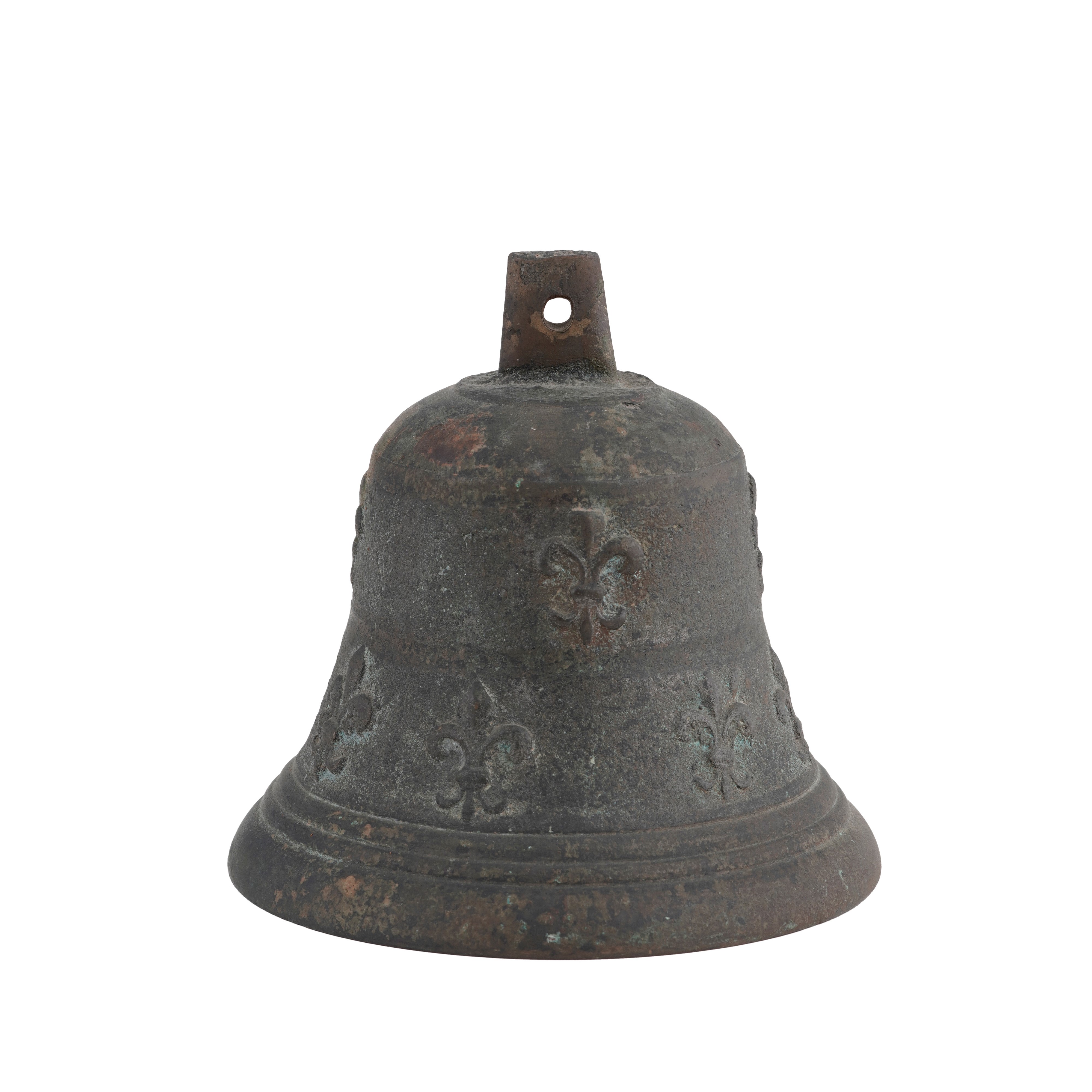 Piccola campana in bronzo con corpo decorato a gigli in rilievo. Italia, XIX secolo