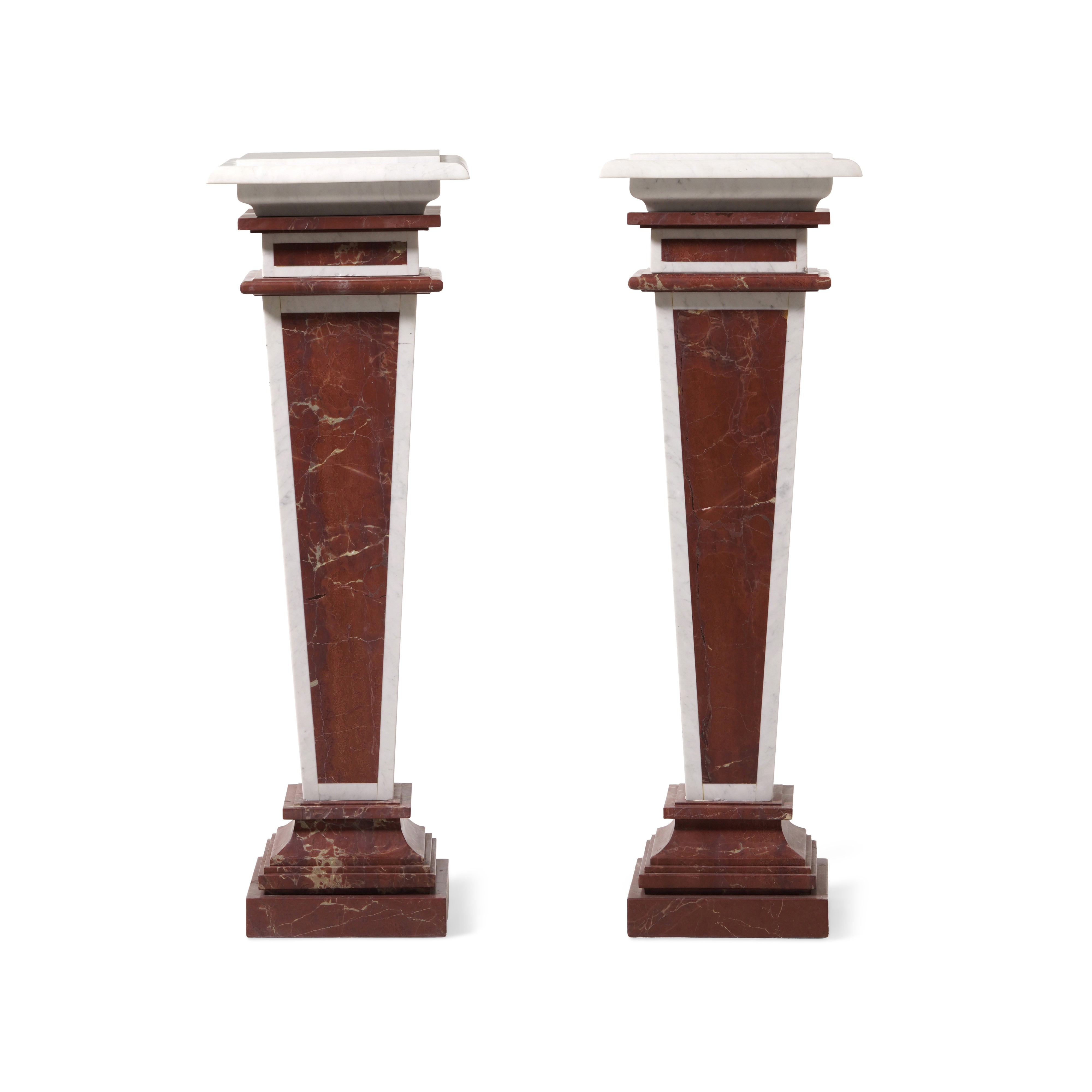 Coppia di colonne a Erma bicolore rosso e bianco. XX secolo.