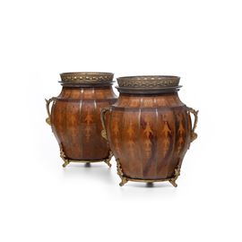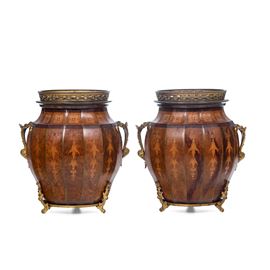 Coppia di vasi in legno intarsiato e bronzo dorato. XIX secolo