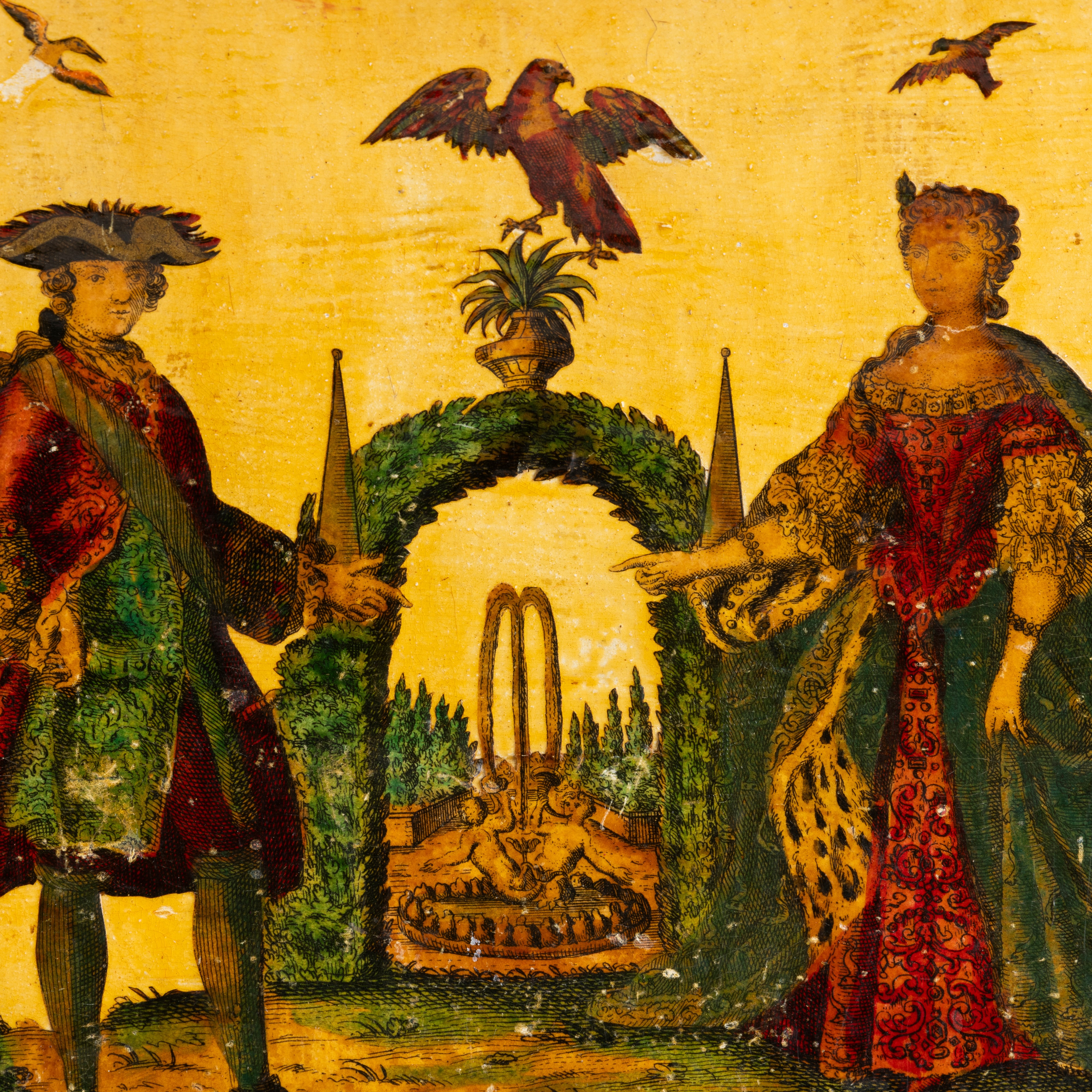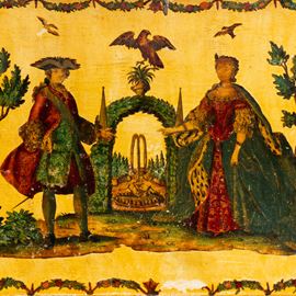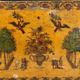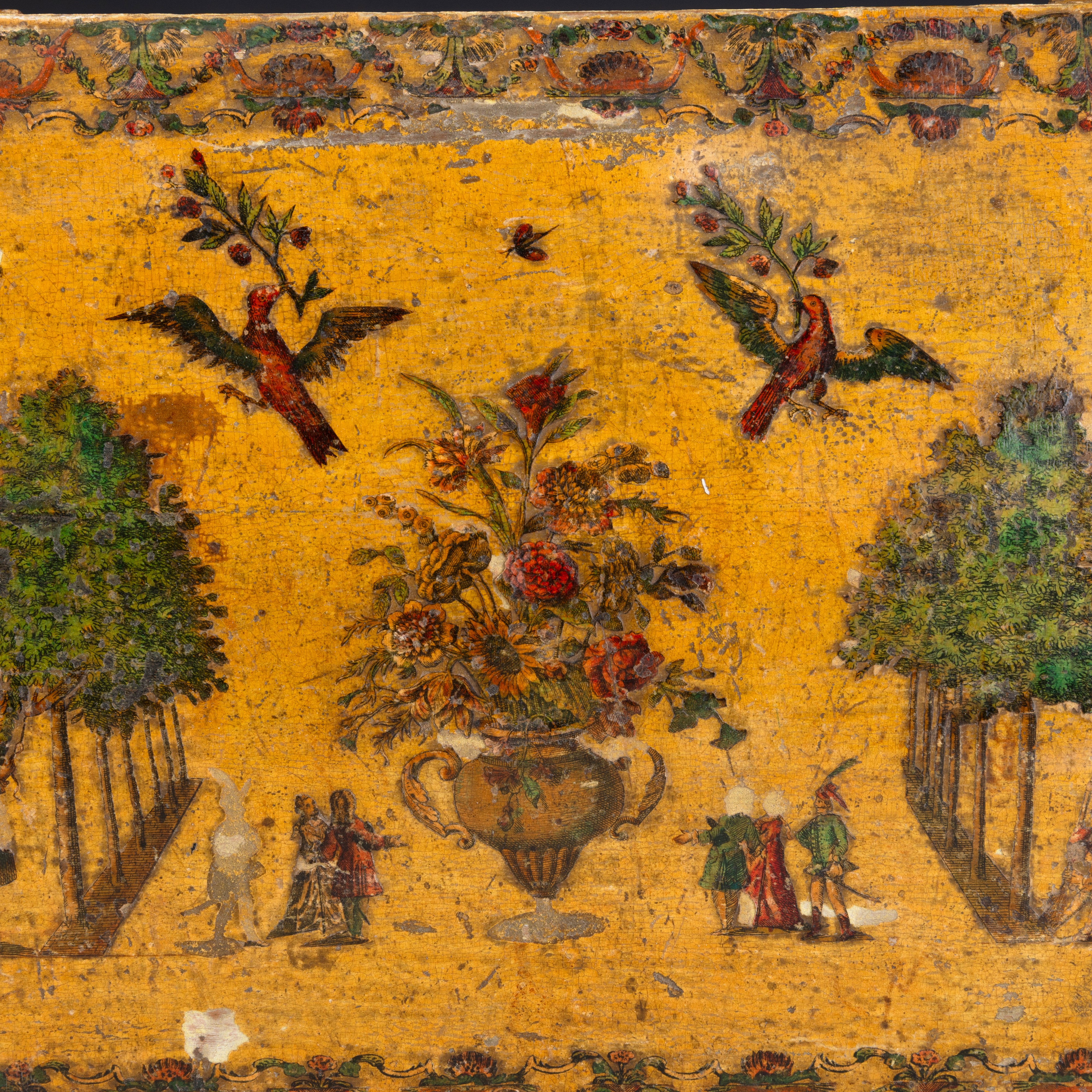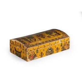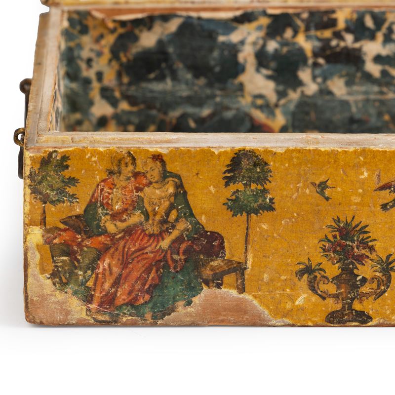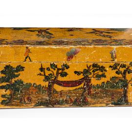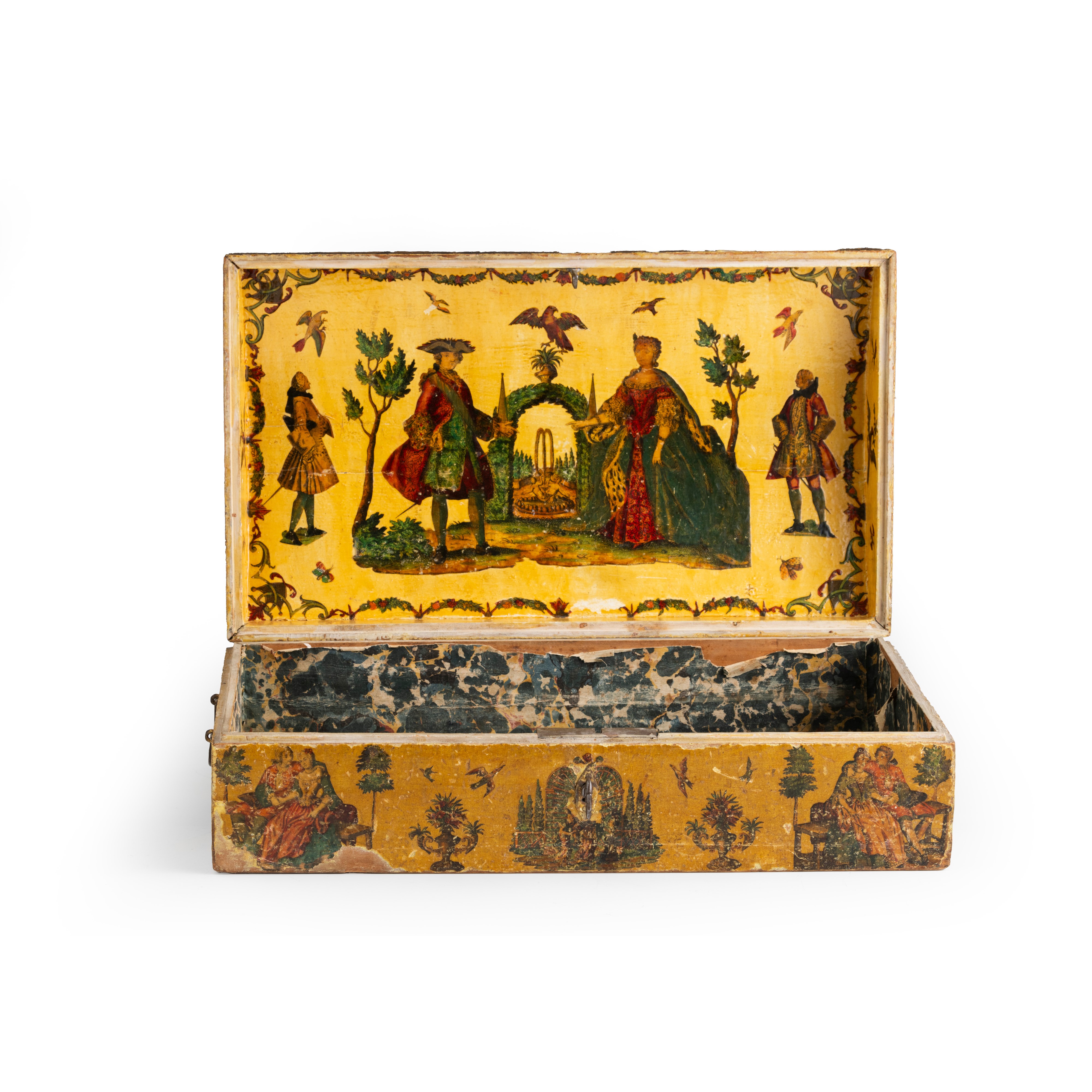 Legno laccato a fondo ocra, decorazioni policrome ad arte povera con scene di corte, figure settecentesche e scene galanti. Dotata di maniglie e chiave. Coperchio bombato con all’interno ritratto di regnanti in un paesaggio con fontana.