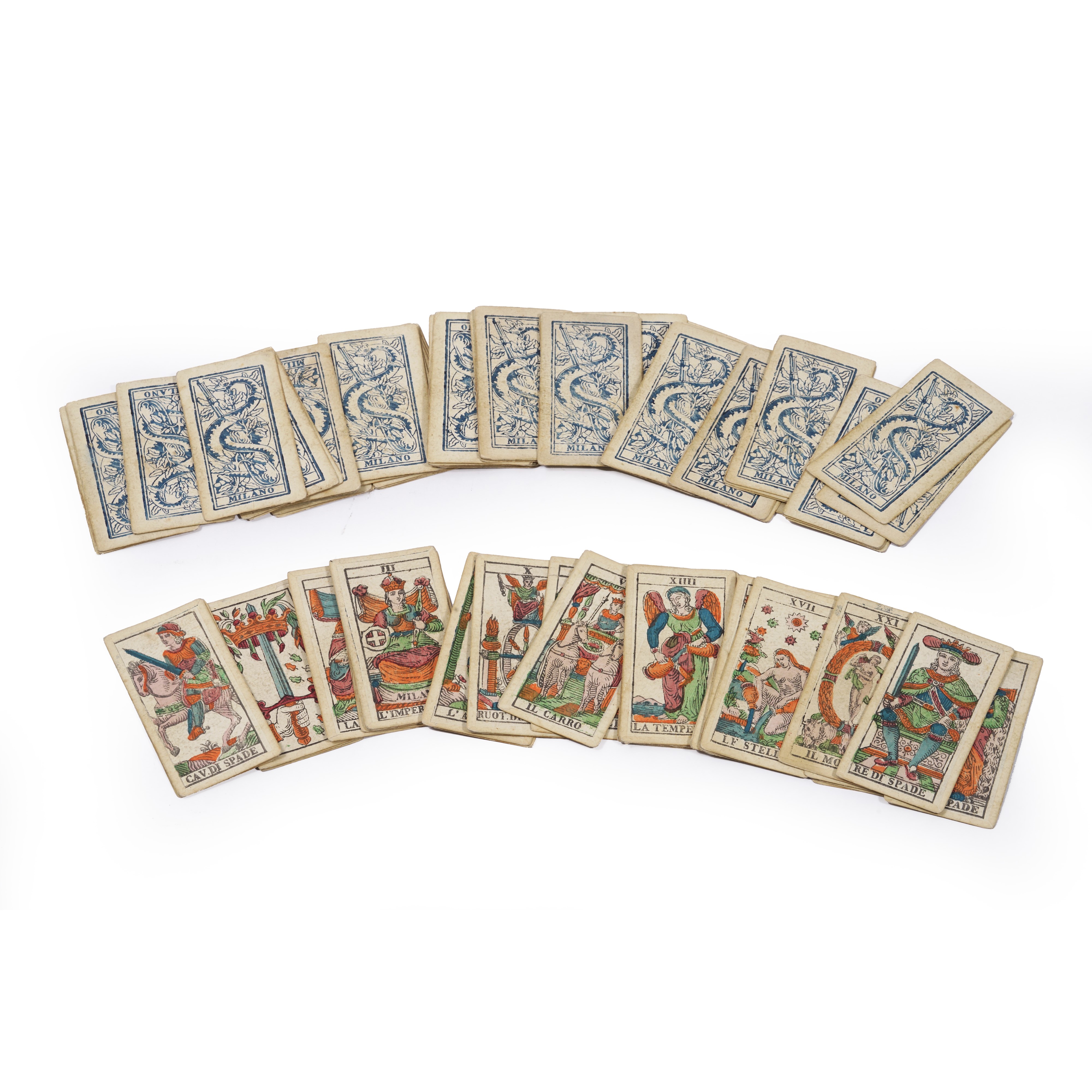 Mazzo completo di 78 carte dei tarocchi. Milano, 1862