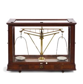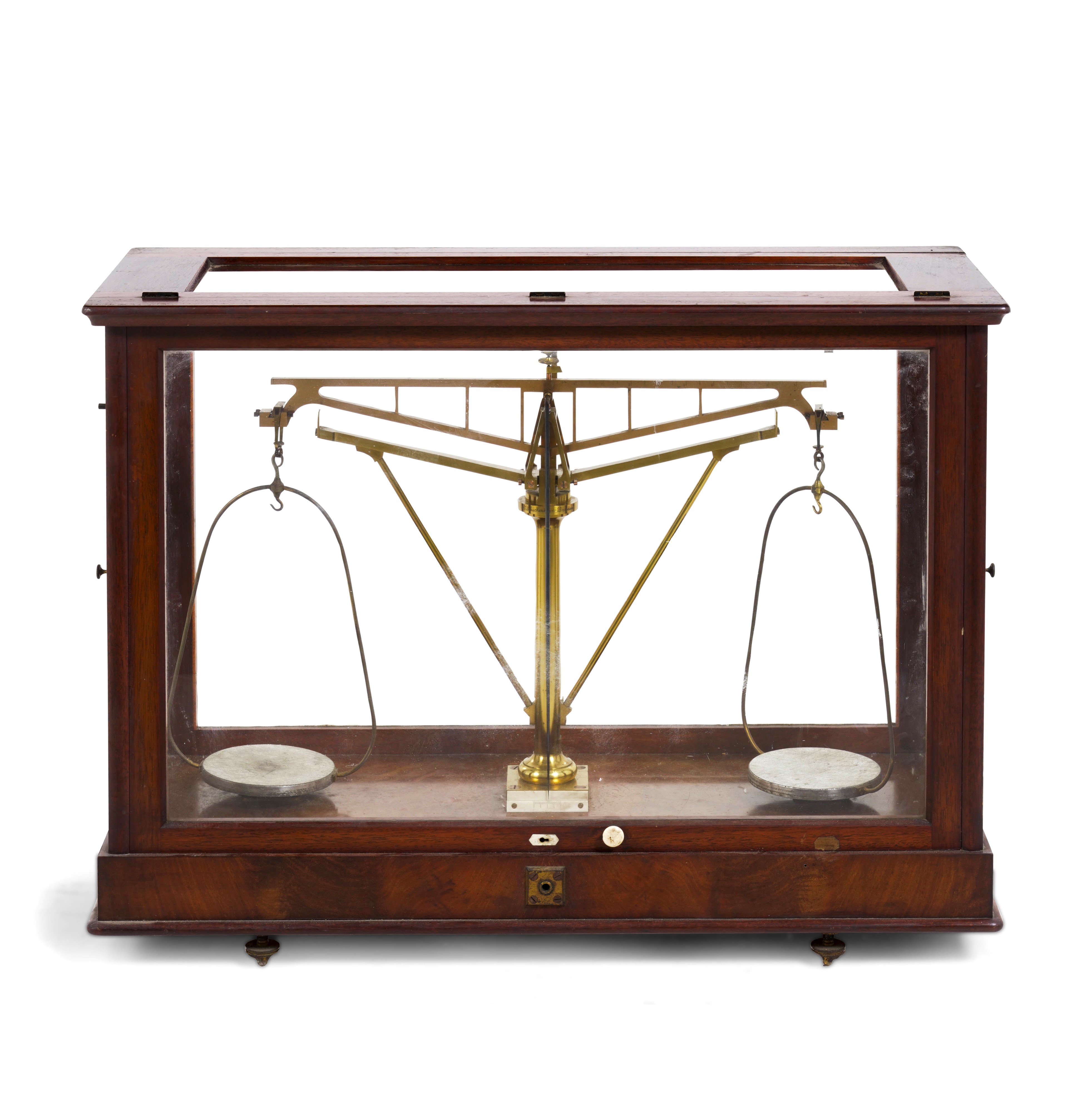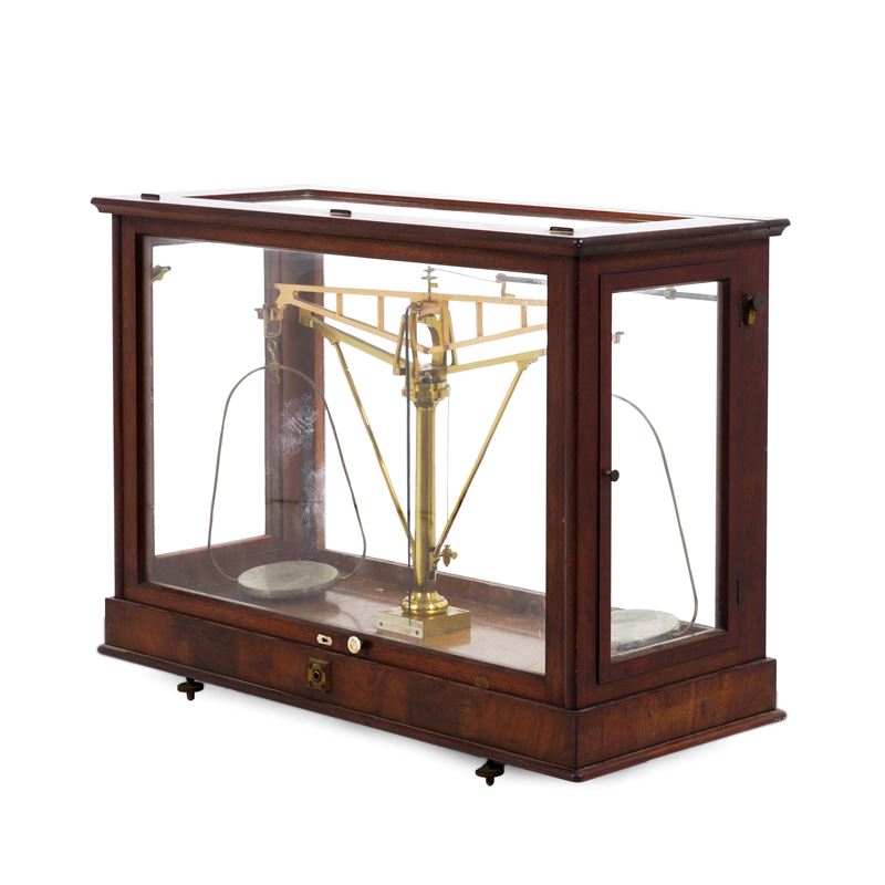 Bilancia di precisione in ottone entro teca in vetro e legno